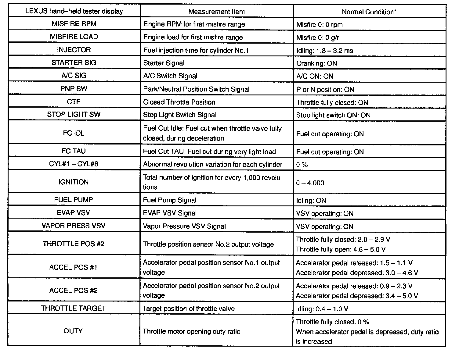 NORMAL ENGINE OPERATING CONDITIONNOTE: The values given for "Normal Condition" are representative values, so a vehicle may still be normal even if its value varies differ from those listed here. So do not decide whether a part is faulty or not solely according to the "Normal Condition" here.