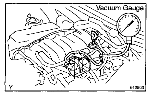 i. While the engine is idling, check that the vacuum gauge needle momentarily fluctuates up to approx. 39.9 kPa (300 mmHg, 11.8 in.Hg). (The actuator rod is pulled out.)