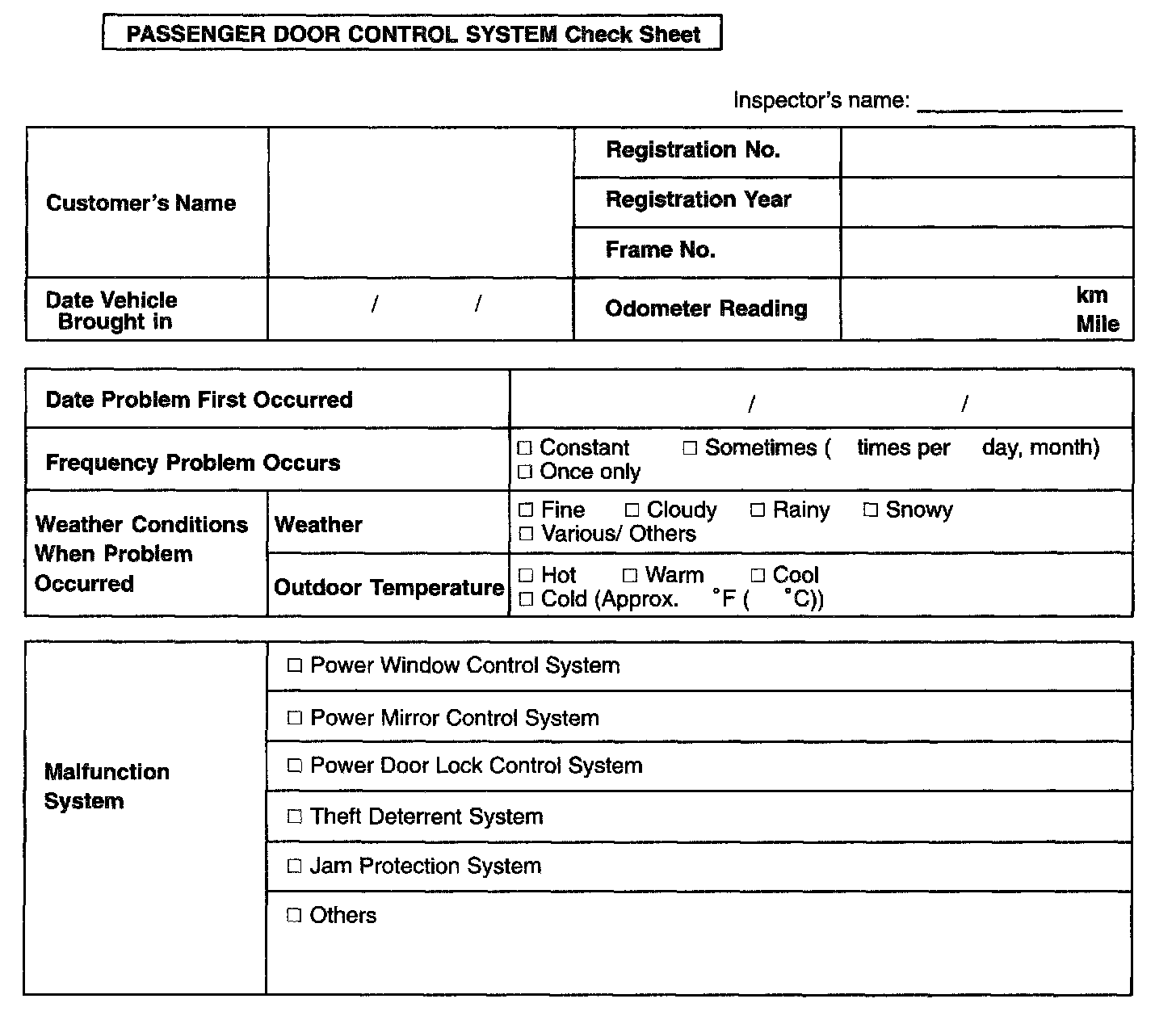 Passenger Door Control System Check Sheet: