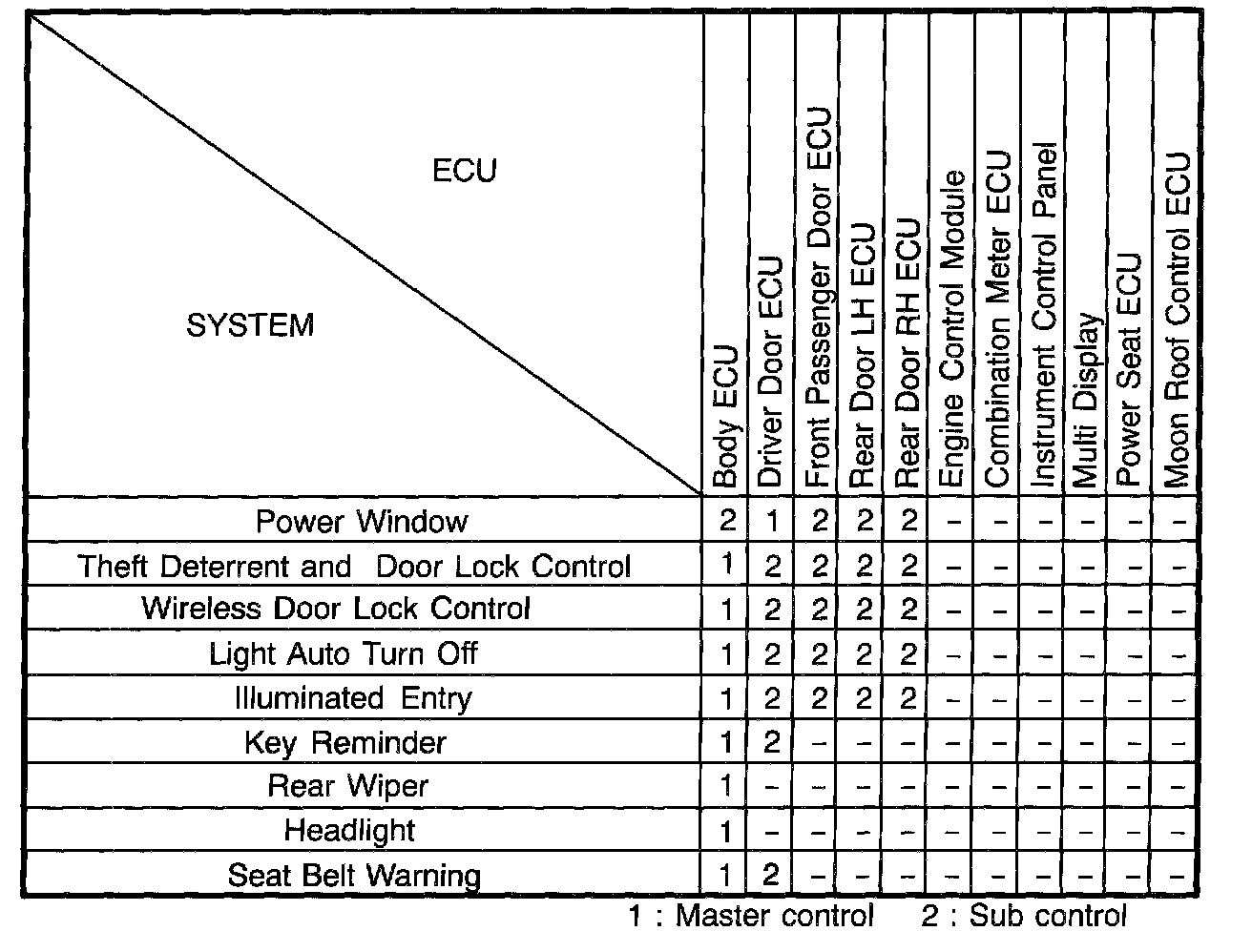 The system is comprised of the communication modes of the body ECU, driver door ECU, front passenger door ECU, rear door LH ECU, rear door RH ECU, engine control module, combination meter ECU, multi display, instrument control panel, power seat ECU and moon roof control ECU. The body electrical systems are controlled by a serial communication in which each ECU is linked to another via a single communication line. This system is also equipped with a self-diagnosis function. The table shows the systems under the control of the multiplex communication system and related ECUs (Communication nodes).