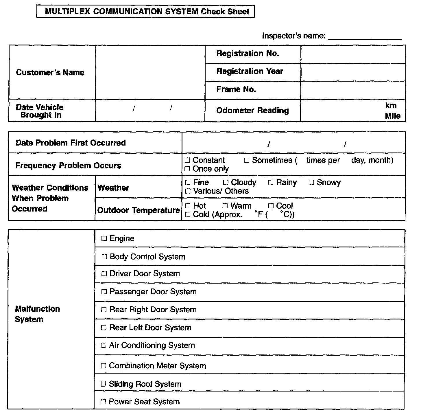 Multiplex Communication System Check Sheet:
