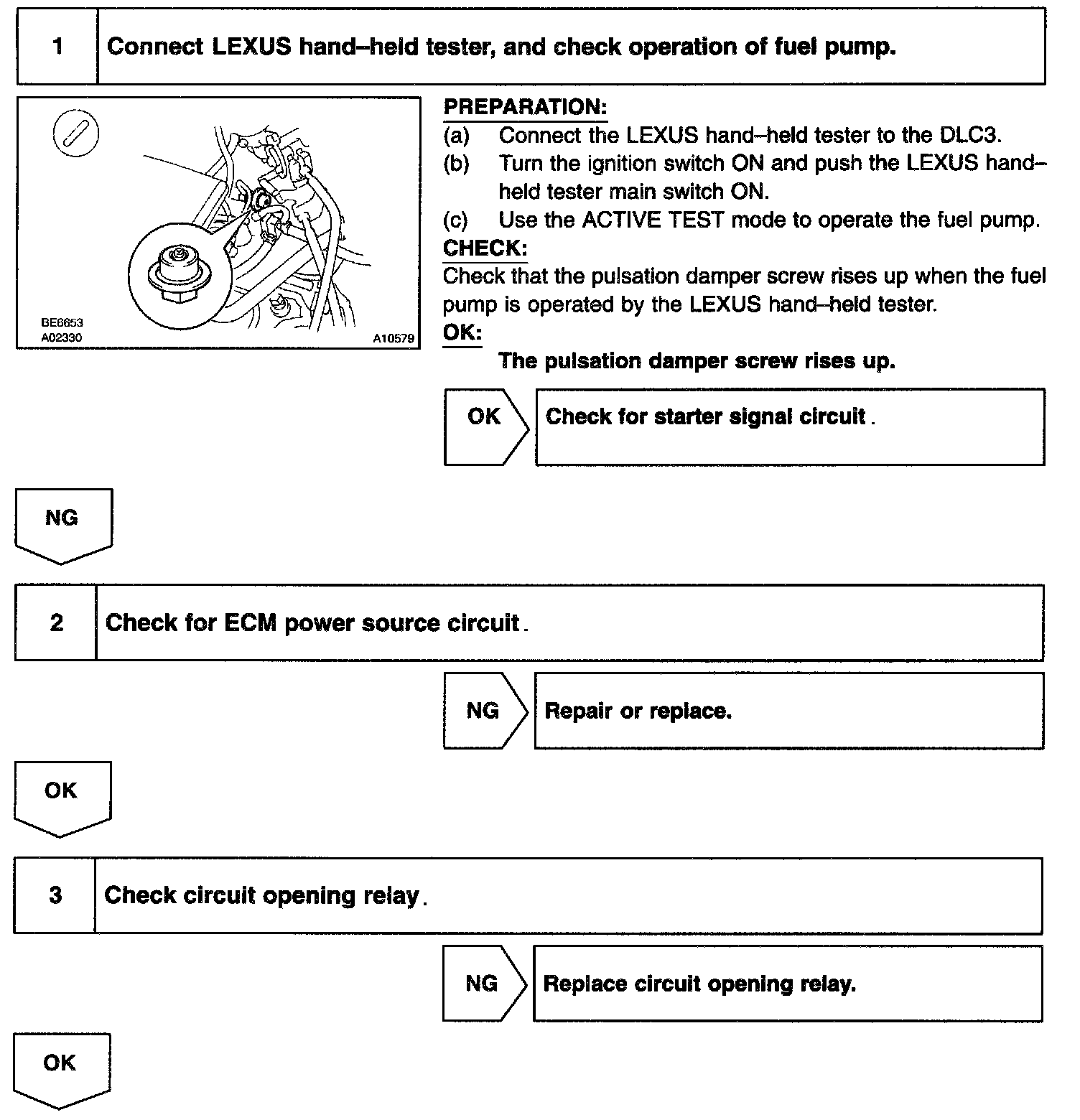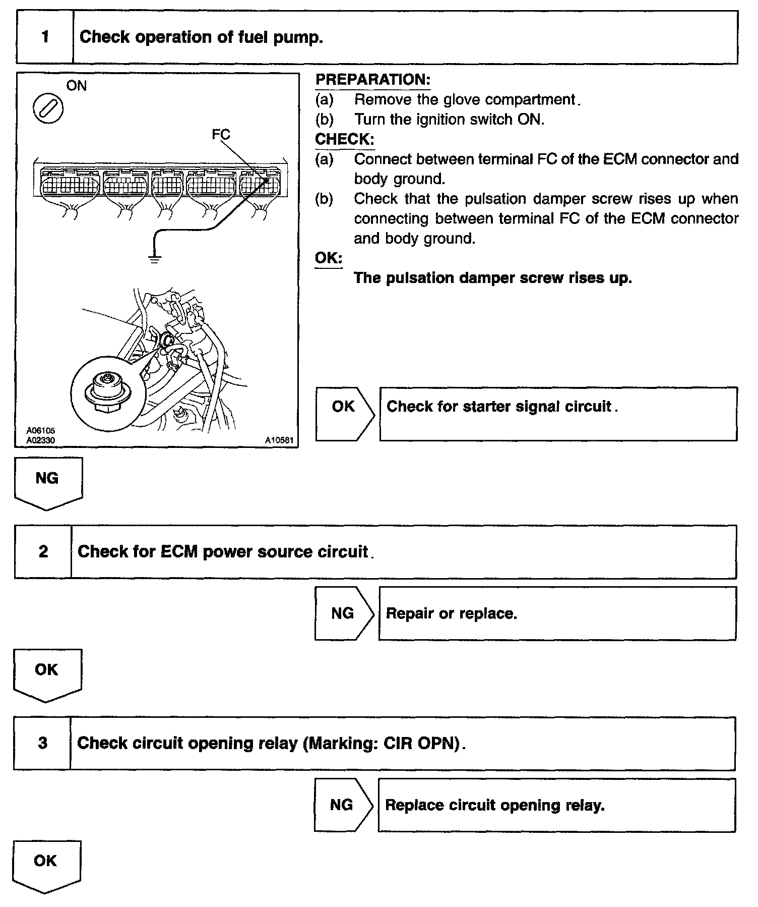 When the STA signal and NE signal are input to the ECM, Tr is turned ON, current flows to coil of the circuit opening relay, the relay switches on, power is supplied to the fuel pump and the fuel pump operates. While the NE signal is generated (engine running), the ECM keeps Tr ON (circuit opening relay ON) and the fuel pump also keeps operating.