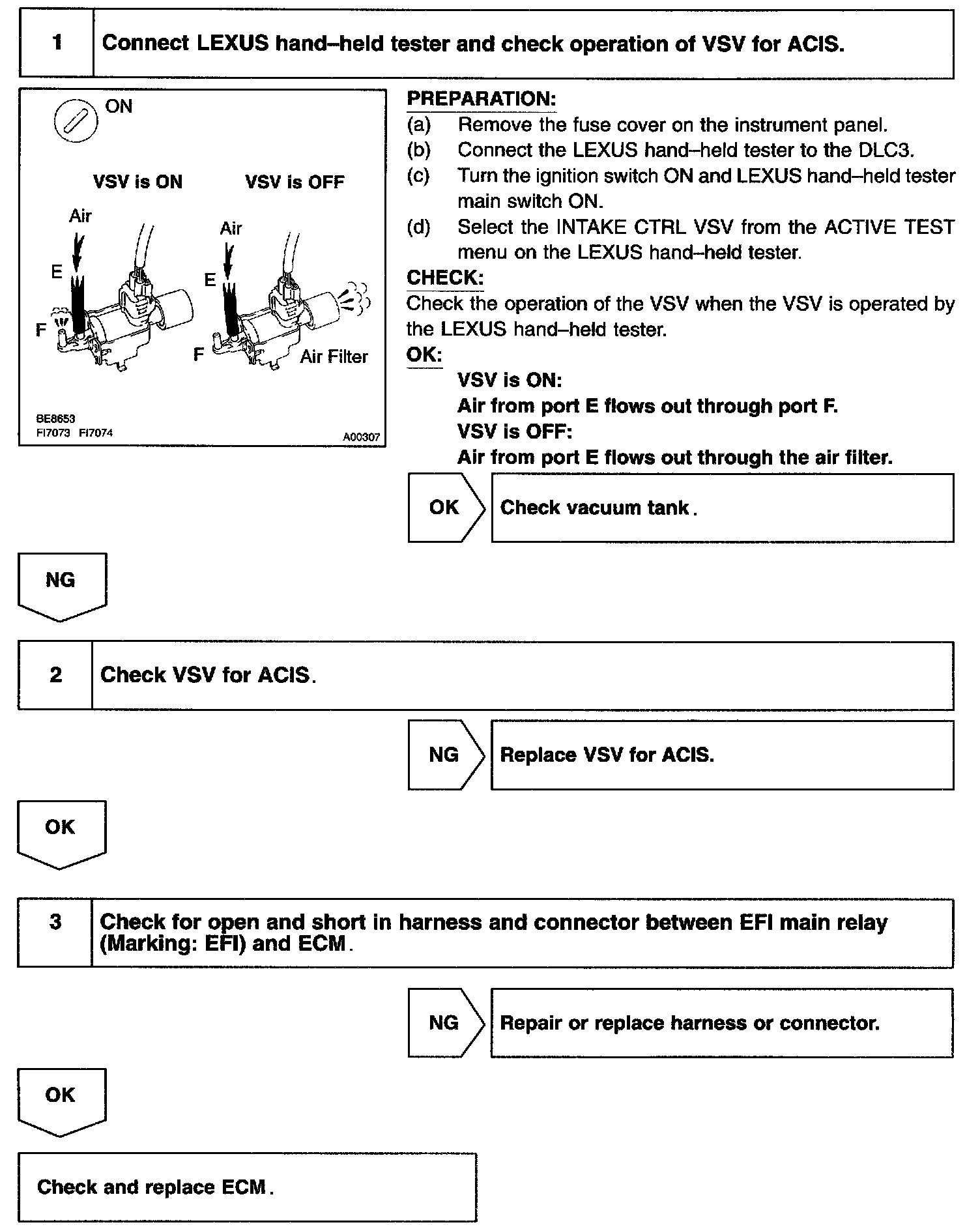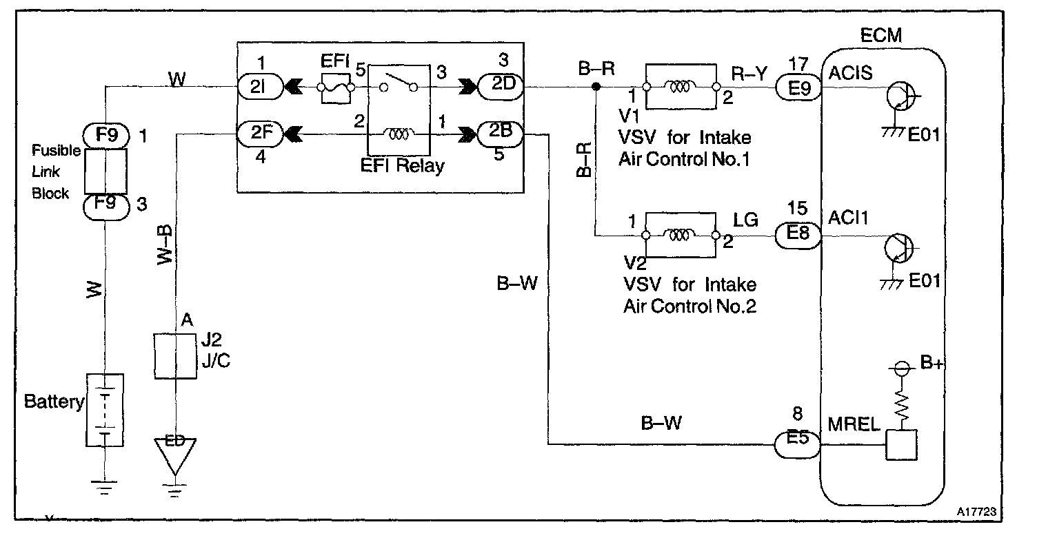 CIRCUIT DESCRIPTIONThis circuit opens and closes the IACV (Intake Air Control Valve) in response to the engine load in order to increase the intake efficiency (ACIS: Acoustic Control Induction System).