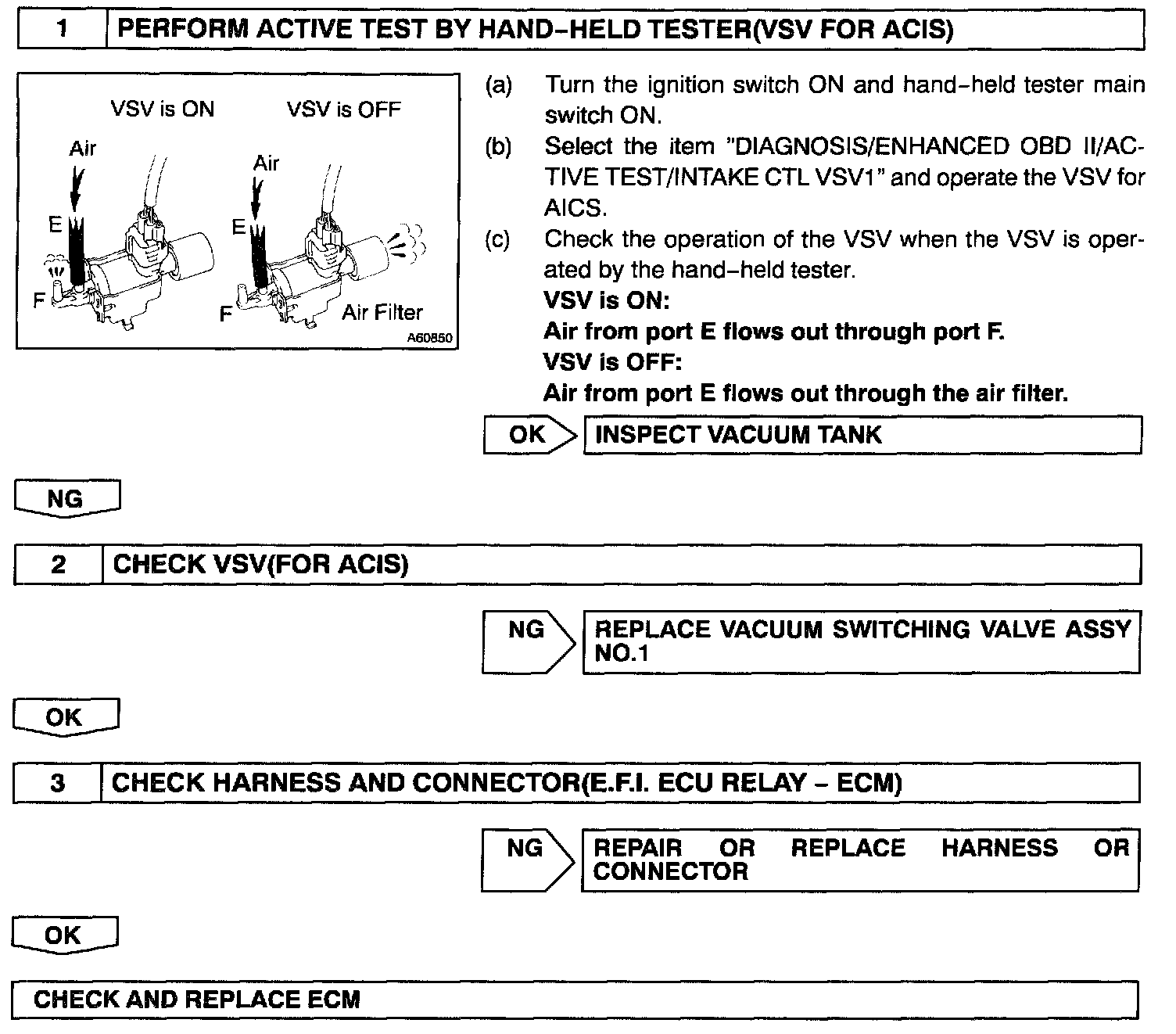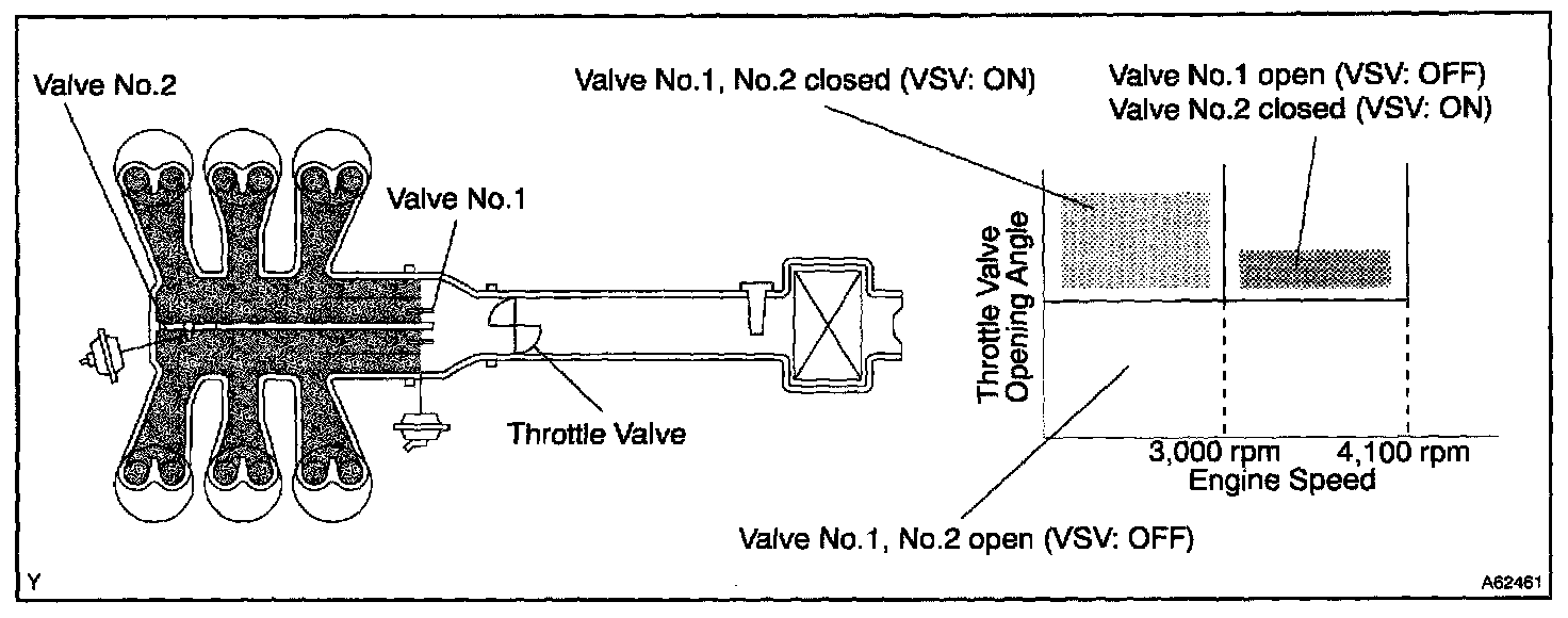 When the engine speed is 4,100 rpm or less and the throttle valve opening angle is 30° or more, the ECM turns the two VSV ON or OFF and operate the Intake Air Control Valve.