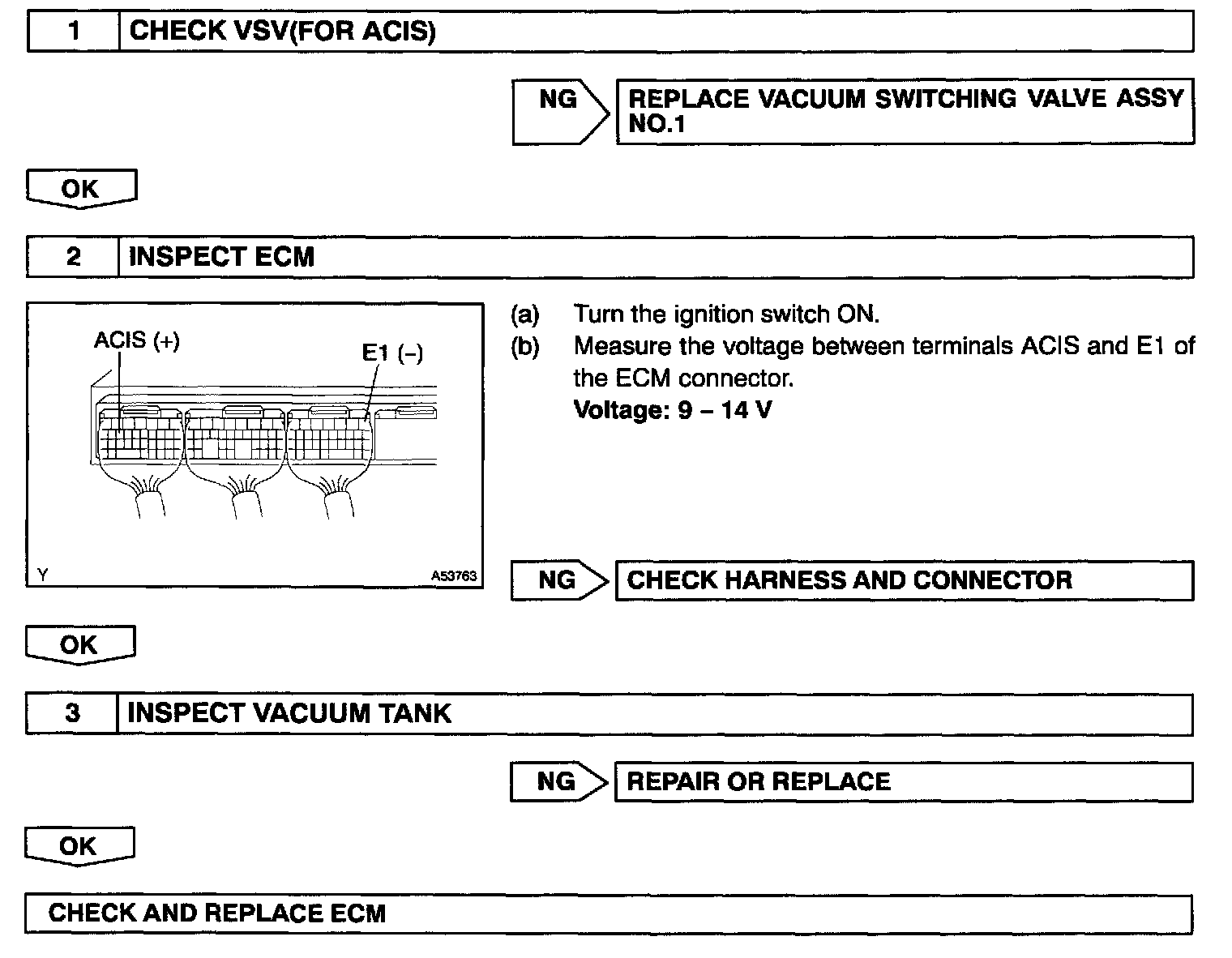CIRCUIT DESCRIPTIONThis circuit opens and closes the Intake Air Control Valve in response to the engine load in order to increase the intake efficiency (ACIS: Acoustic Control Induction System).