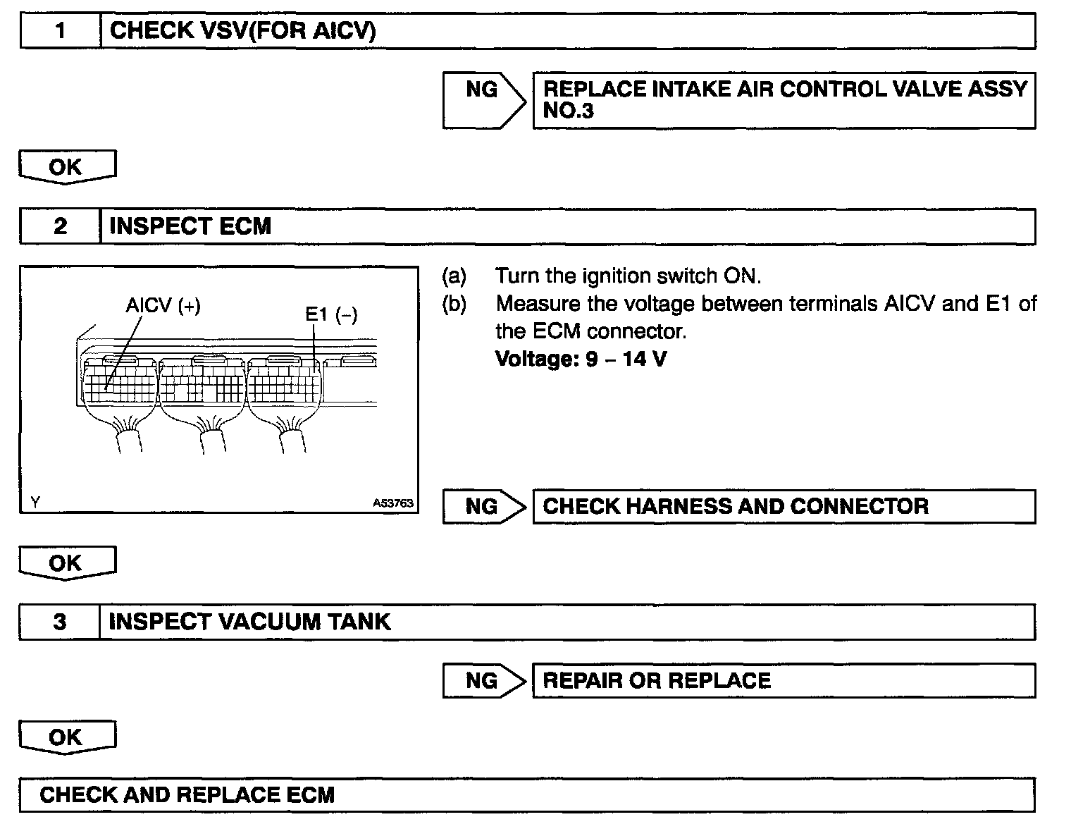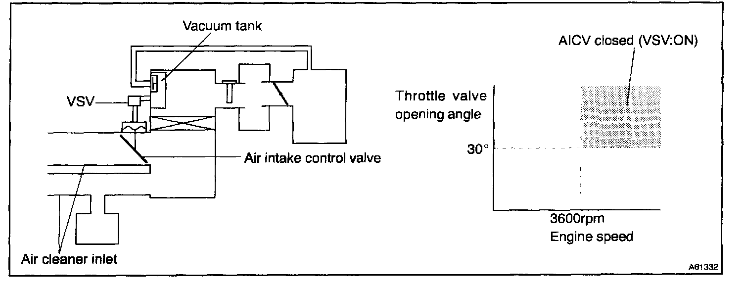 When the engine speed is more than 3600 rpm and the opening of the throttle valve is more than 30°, the ECM activates VSV ON and operates AICV.