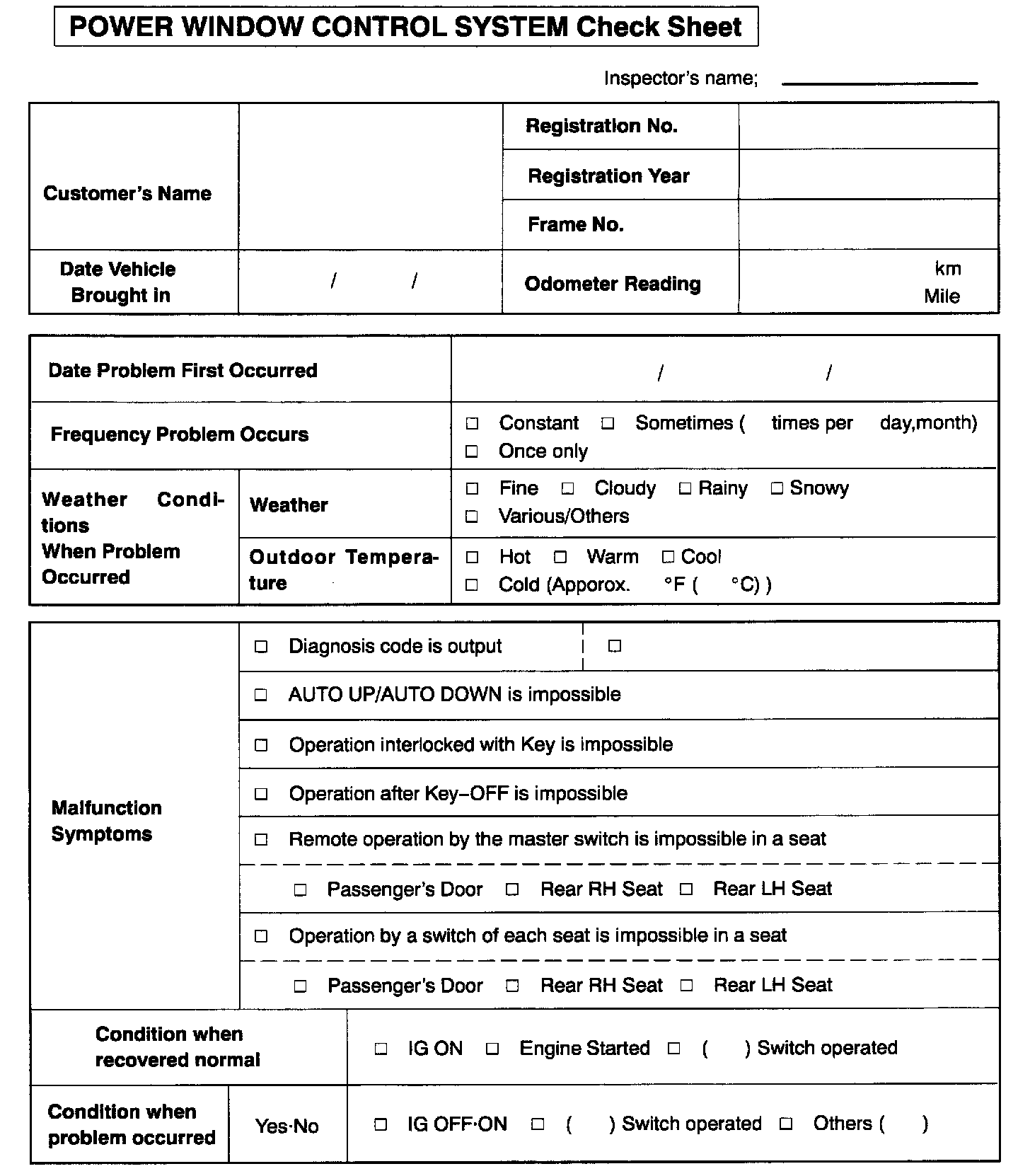 Power Window Control System Check Sheet: