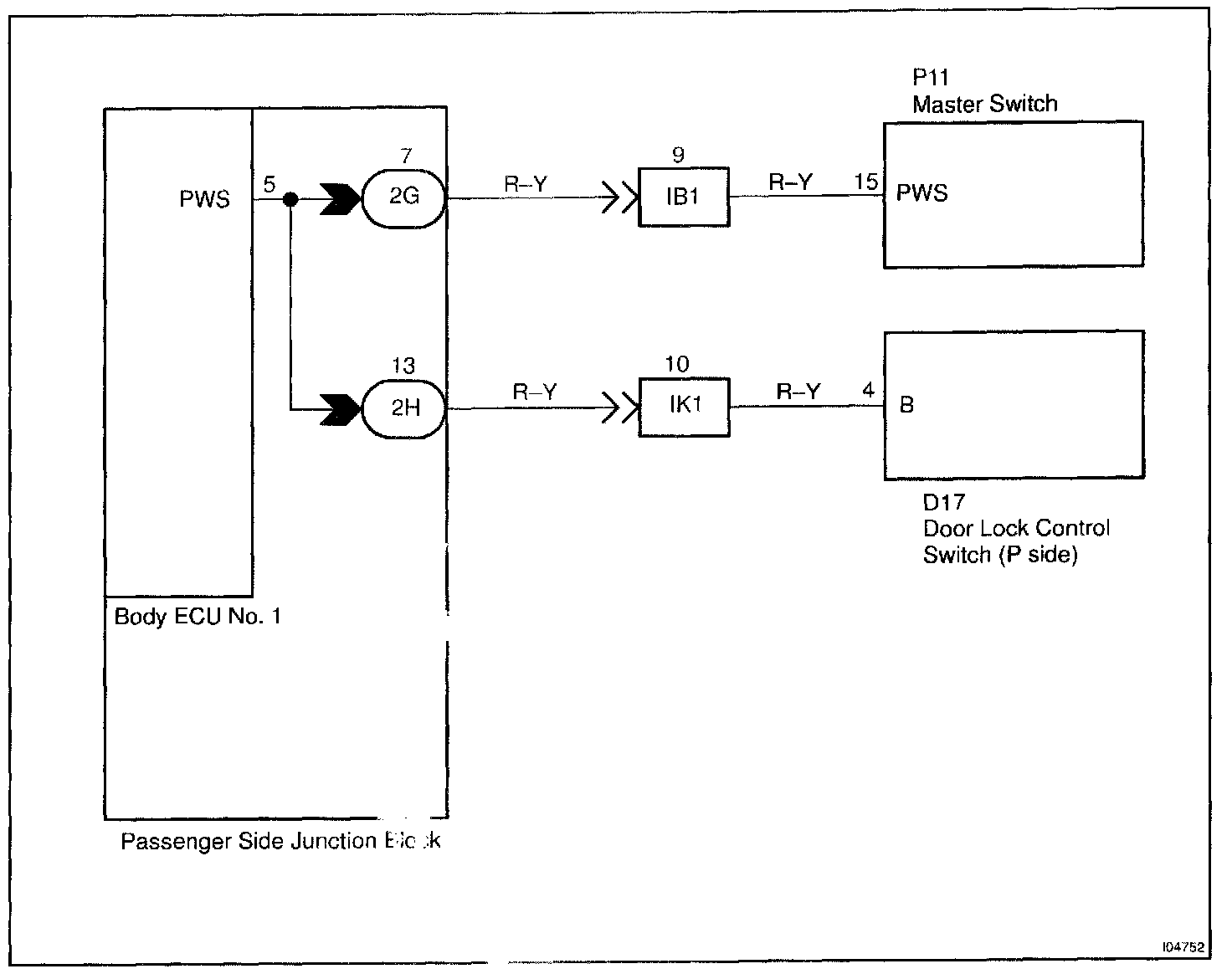 This circuit is the power source of the master switch for the driver's door and the door lock switch for the passenger's doors.