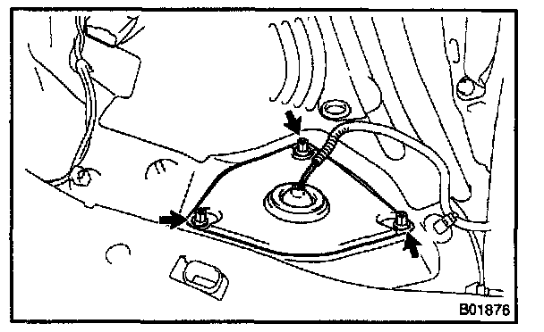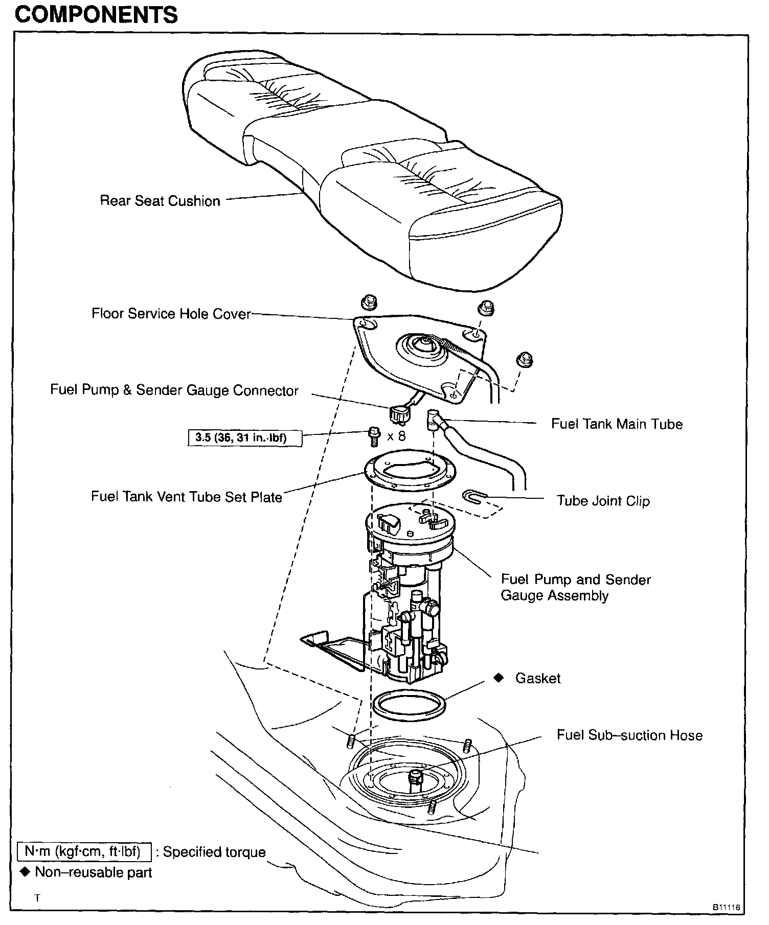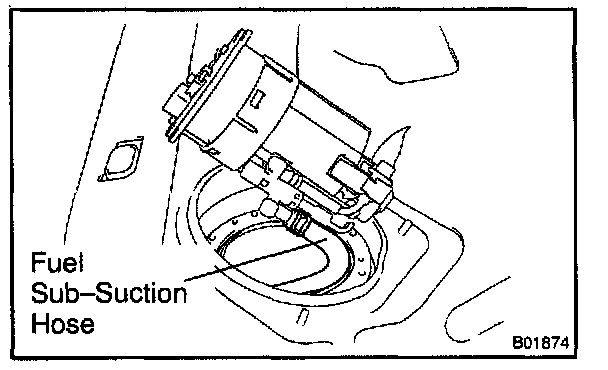 b. Lift up the fuel pump and sender gauge assembly and disconnect the fuel sub-suction hose from the fuel return jet tube and remove the fuel pump, sender gauge assembly and gasket.