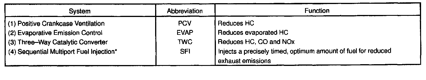 The emission control Systems are installed to reduce the amount of HC, CO and NOx exhausted from the engine ((3) and (4)), to prevent the atmospheric release of blow-by gas-containing HC (1) and evaporated fuel containing HC being released from the fuel tank (2).