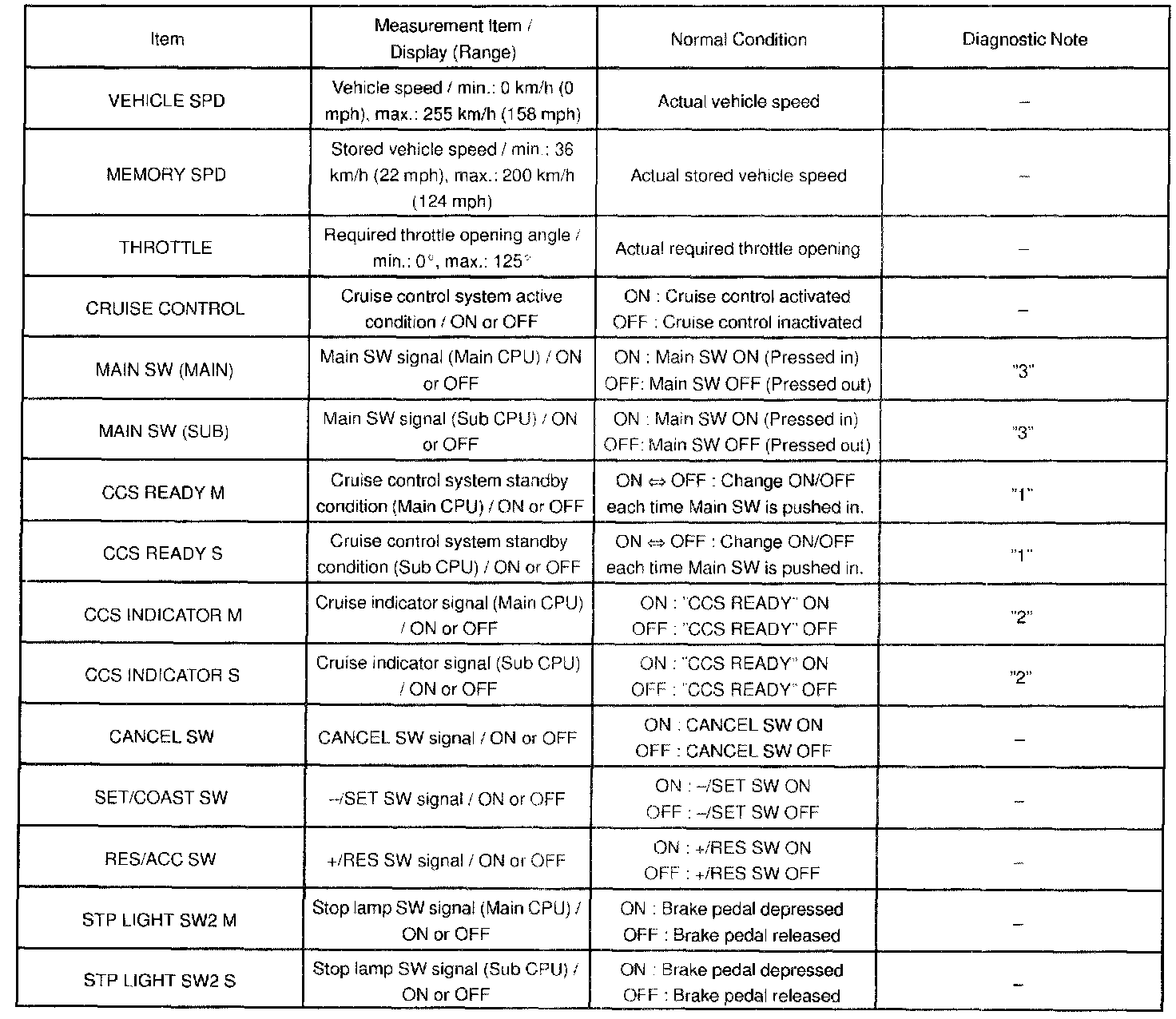"3" is OK but cruise indicator not turn on -> CRUISE MAIN indicator or wire harness or ECM failure.