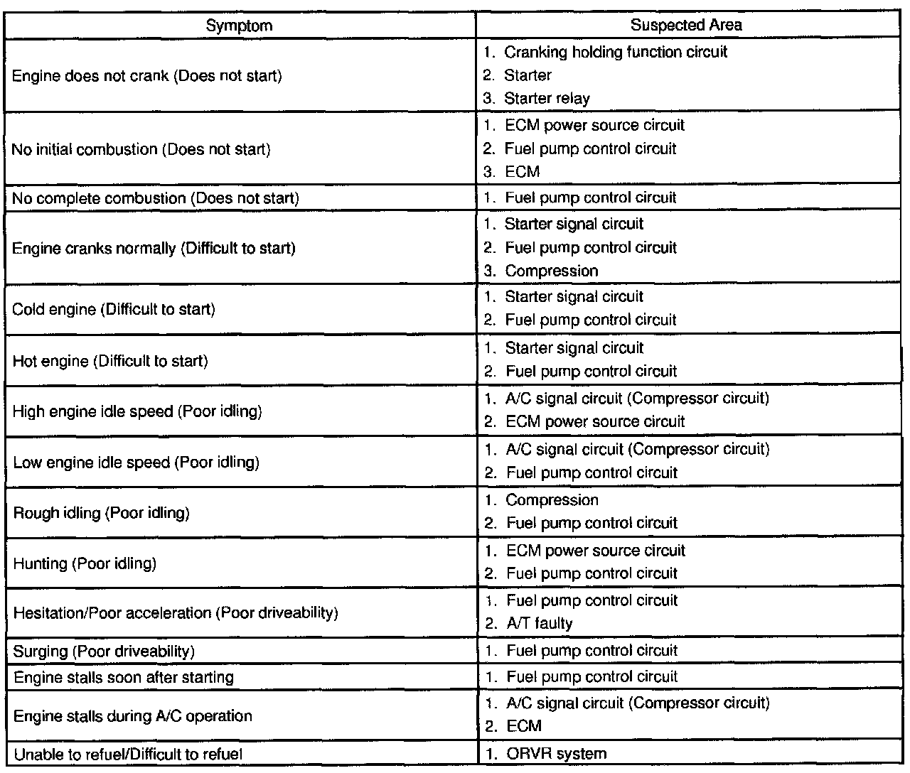 Problem Symptoms Table: