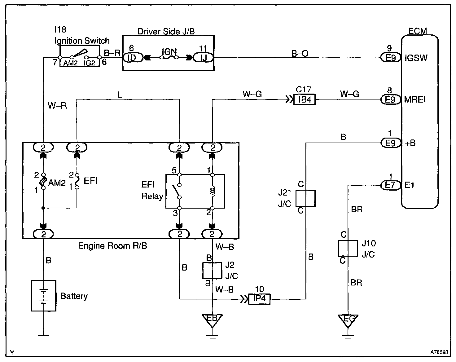 CIRCUIT DESCRIPTIONWhen the ignition switch is turned ON, battery positive voltage is applied to terminal IGSW of the EGM and the EFI relay (Marking: EFI) control circuit in the ECM sends a signal to terminal MREL of the ECM switching on the EFI relay