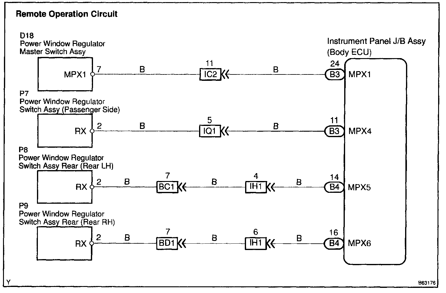 CIRCUIT DESCRIPTIONIf the remote control does not operate, the remote function may have been disabled by a malfunction that was detected in the power window circuit. Also, when any power window switch or the wire harness has a malfunction, the remote control for the applicable power window does not function.