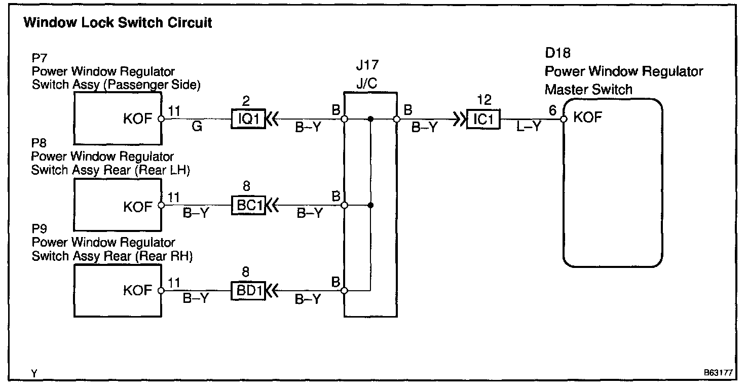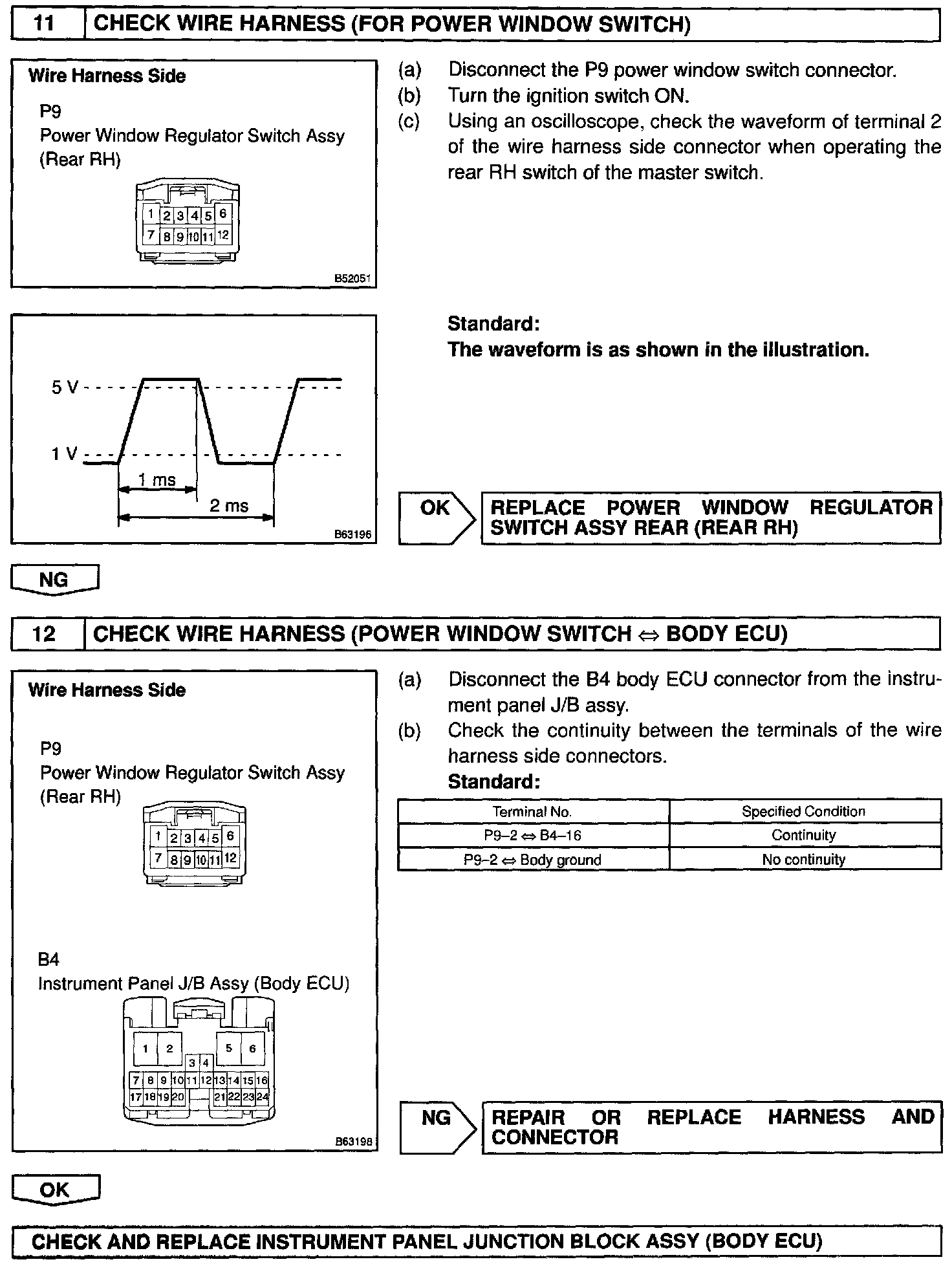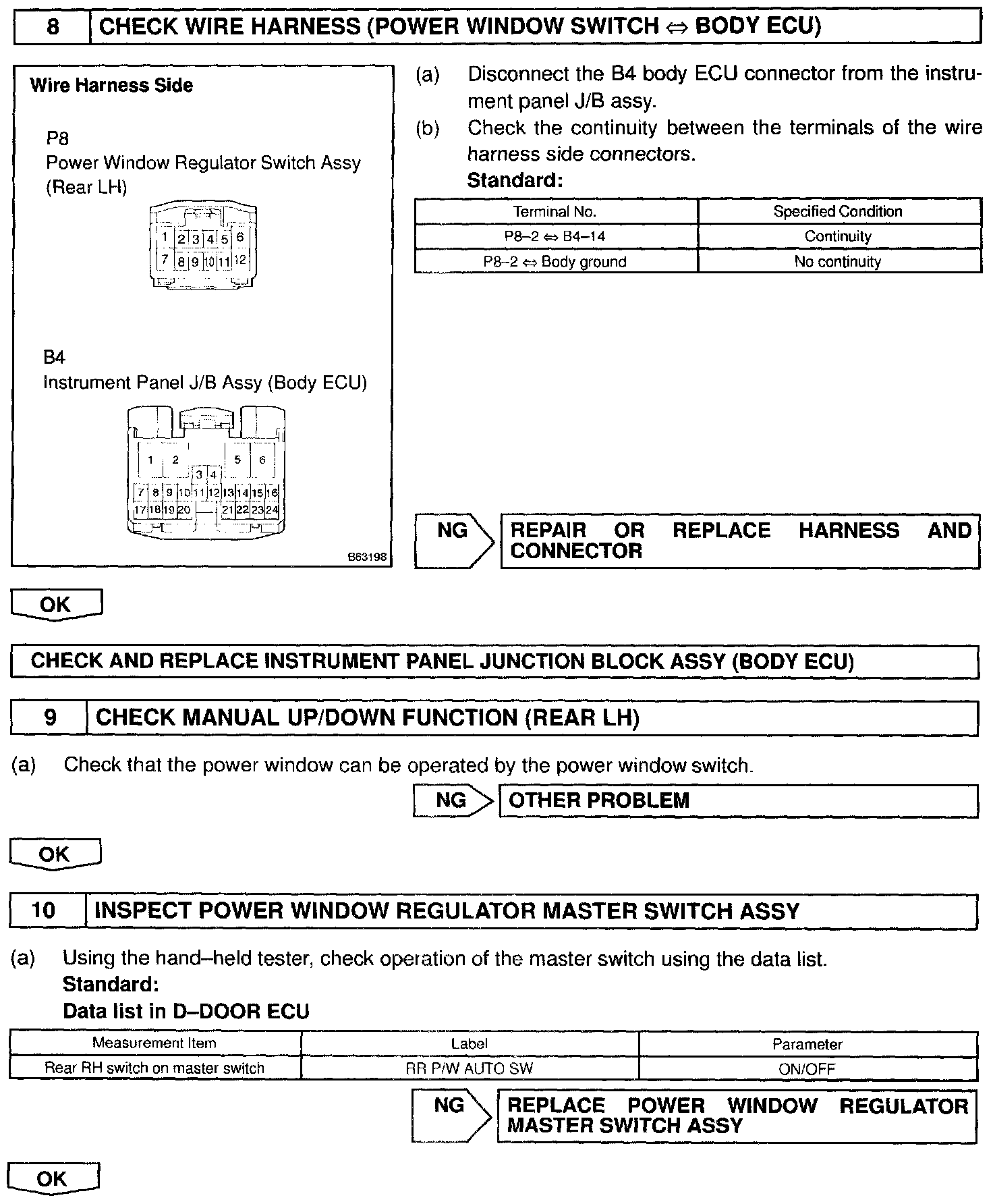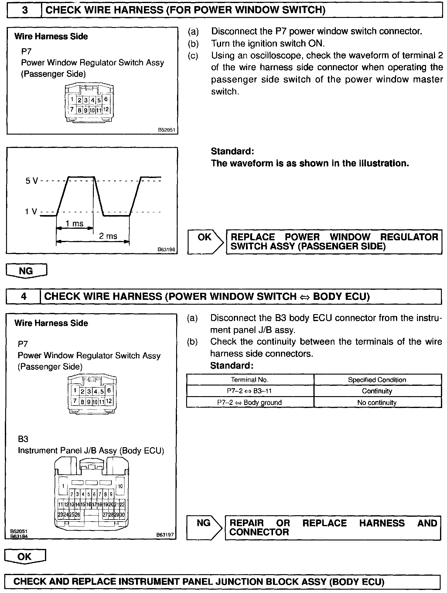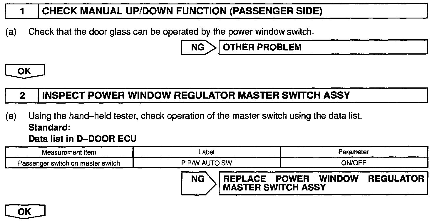 HINT: Check which power window cannot be operated and then proceed with the troubleshooting for the applicable power window as shown in the table.