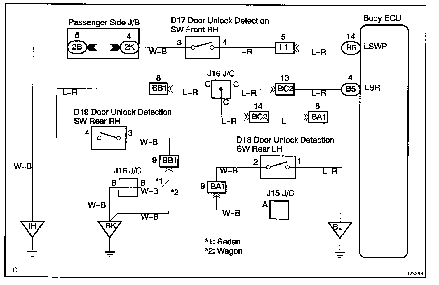 CIRCUIT DESCRIPTIONThe door unlock detection switch is built in the door lock motor assembly. This switch is ON when the door lock knob is in the unlock position and OFF when the lock knob is in the lock position. The ECU detects the door lock knob conditions is this circuit. It is used as one of the operating conditions for the key confinement prevention function.