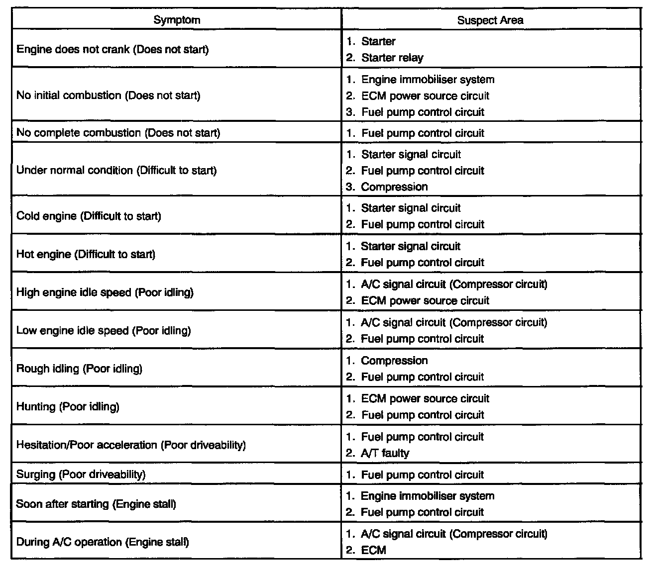 Problem Symptoms Table: