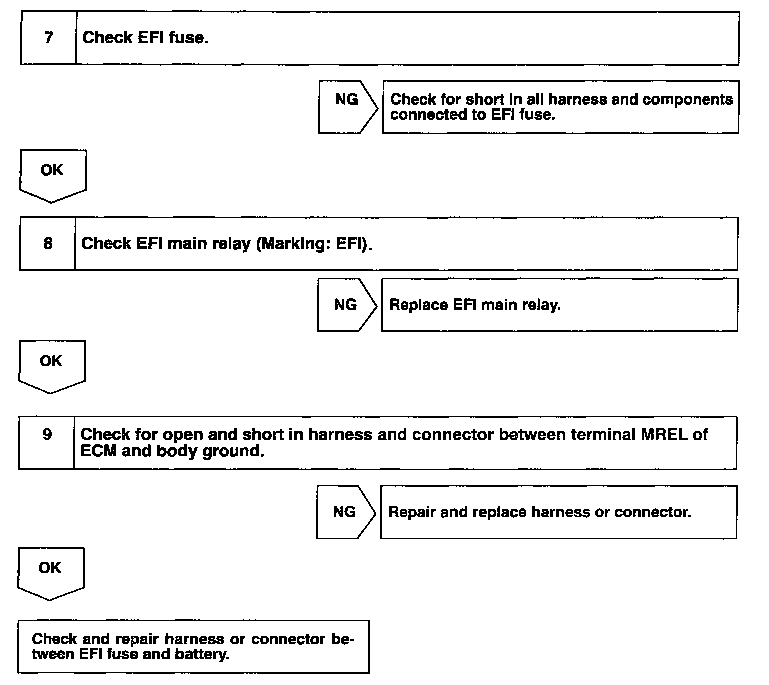 CIRCUIT DESCRIPTIONWhen the ignition switch is turned ON, battery positive voltage is applied to terminal IGSW of the ECM and the EFI main relay (Marking: EFI) control circuit in the ECM sends a signal to terminal MREL of the ECM, switching on the EFI main relay.