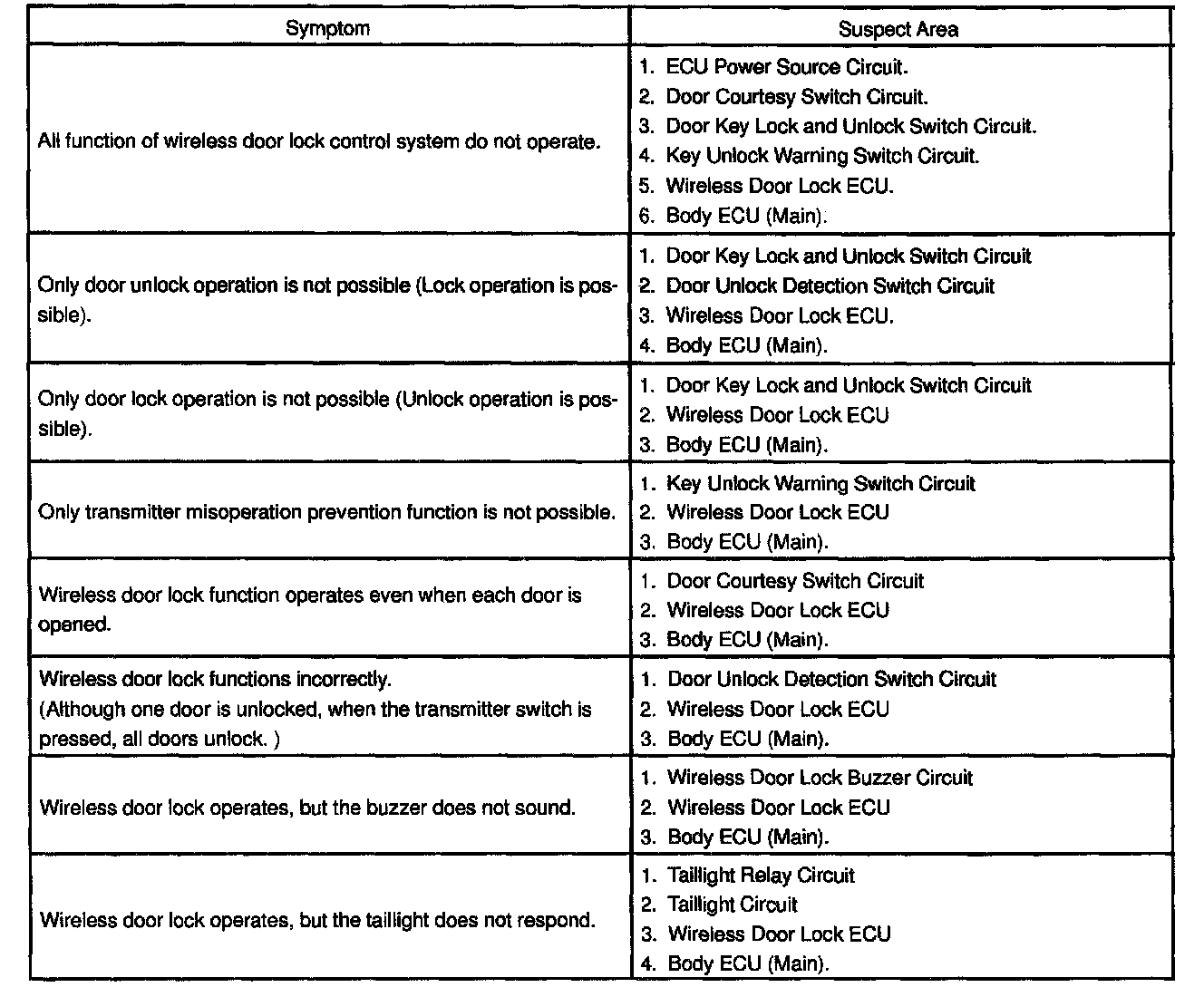 - Troubleshooting of the wireless door lock control system is based on the premise that the door lock control system and theft deterrent system are operating normally. Accordingly, before troubleshooting the wireless door lock control system first make certain that the door lock control system and theft deterrent system are operating normally.
