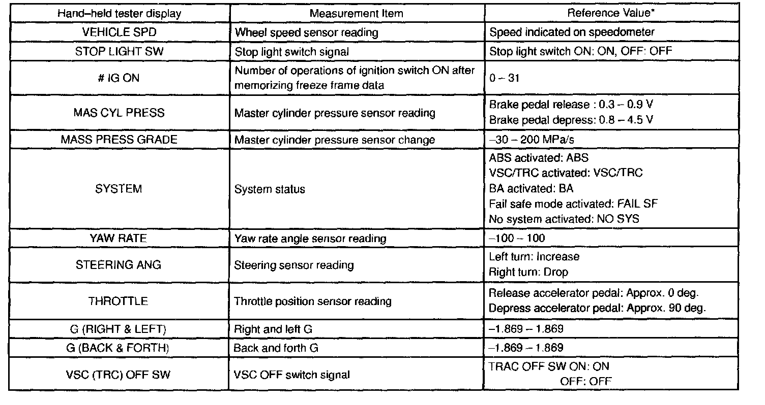a. The vehicle (sensor) status memorized during ABS and/or VSC operation or at the time of error code detection can be displayed by the hand-held tester.