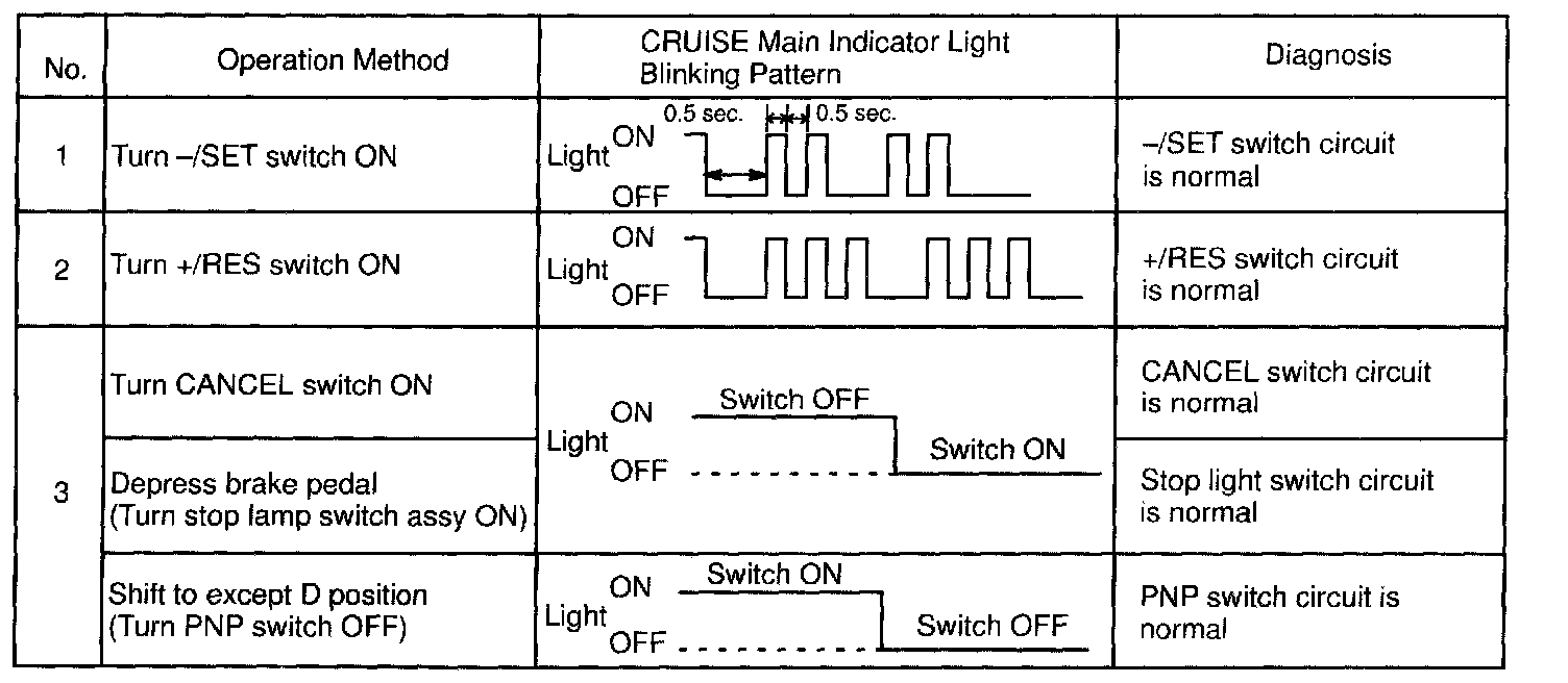 3. Check that the CRUISE main indicator light blinks twice or 3 times repeatedly after 3 seconds.