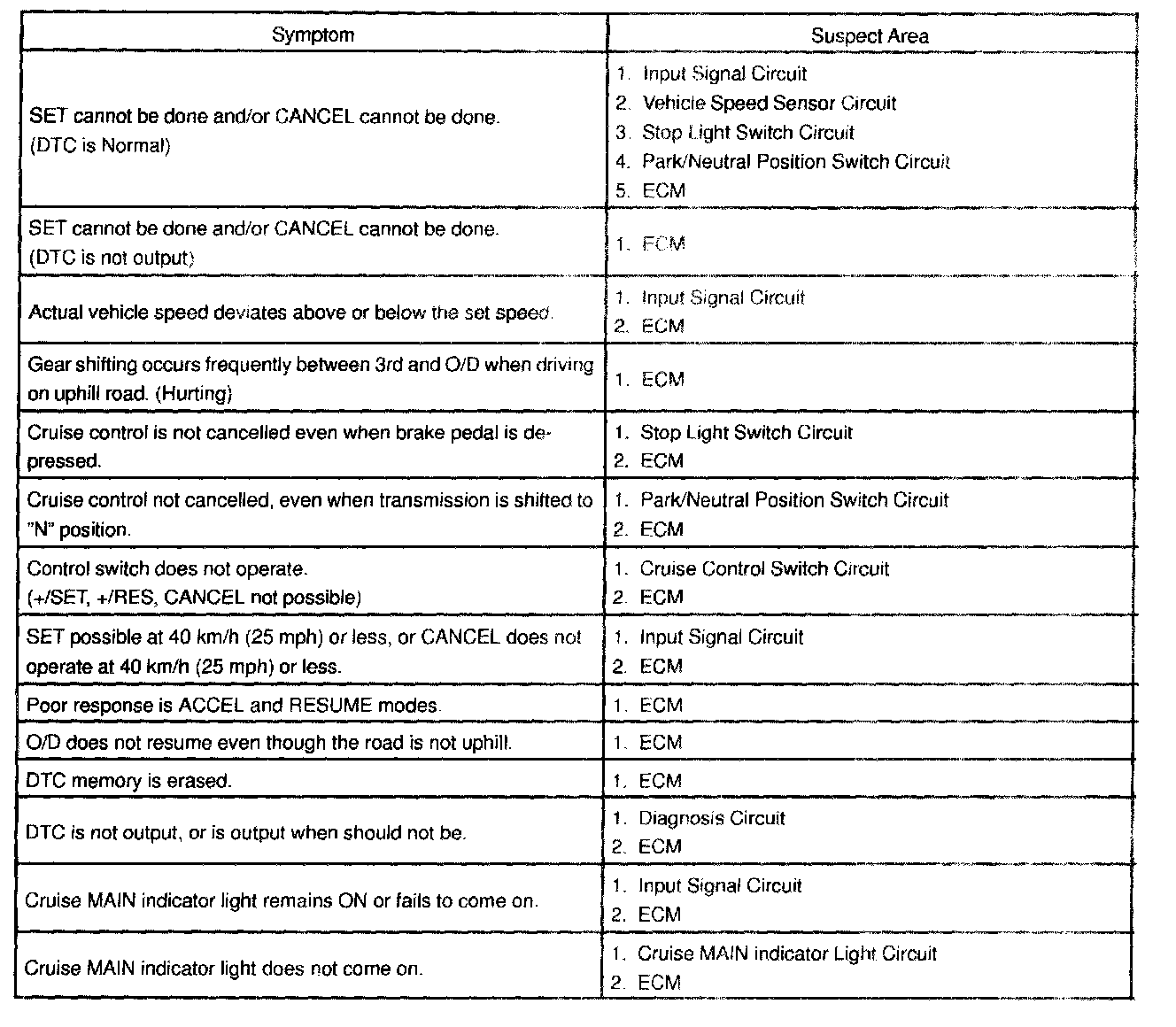 Problems Symptoms Table:
