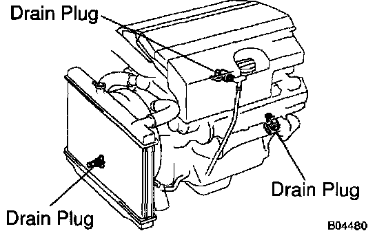 b. Remove the 3 drain plugs on the engine and radiator, and drain the coolant.