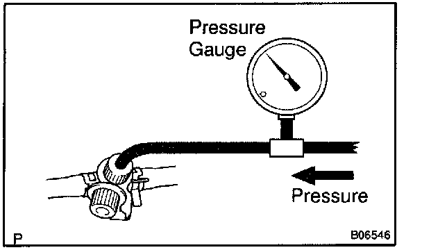 a. Disconnect the EVAP line hose from the charcoal canister side and then pressurize and make the internal pressure in the fuel tank 4 kPa (41 gf/sq.cm, 0.58 psi).