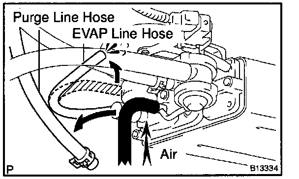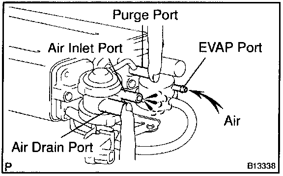 1. While holding the purge port closed, blow air (1.76 kPa, 18 gf/sq.cm, 0.26 psi) into the EVAP port and check that air flows from the air drain port.
