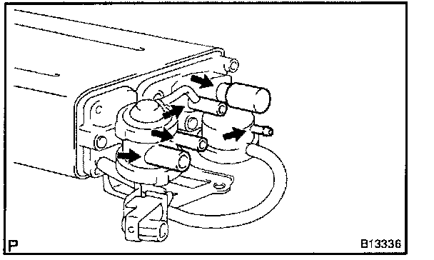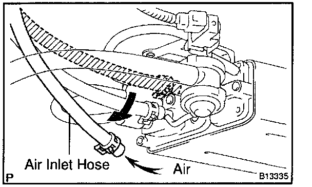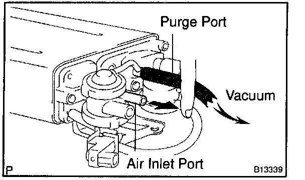 4. While holding the air inlet port closed, apply vacuum (3.43 kPa, 25.7 mmHg, 1.01 in Hg) to the EVAP port and check that air flows into the purge port.