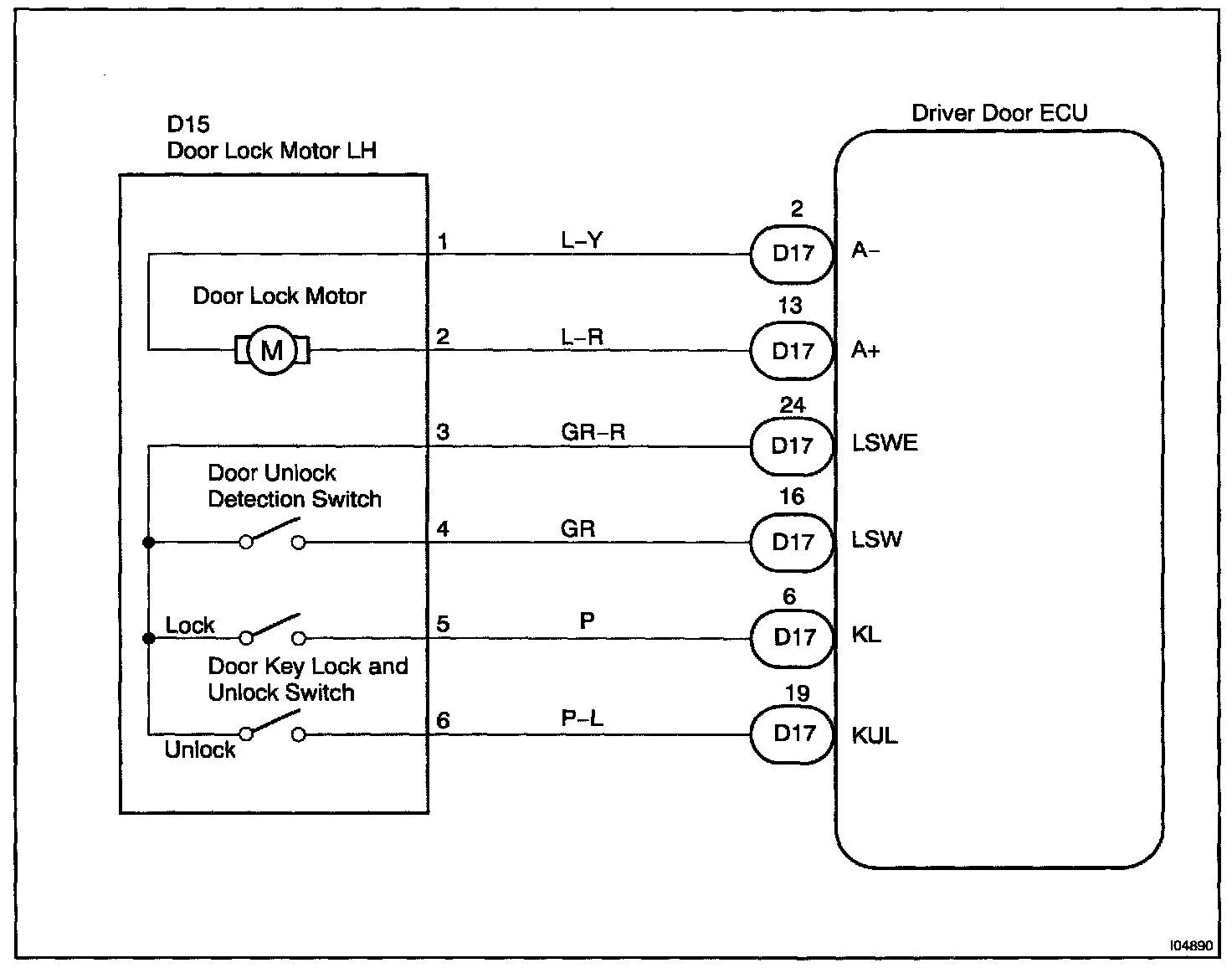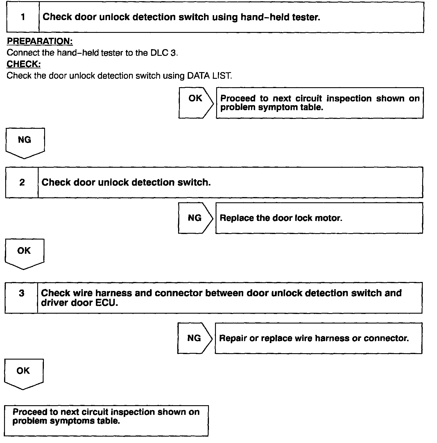 CIRCUIT DESCRIPTIONThe door unlock detection switch is built in the door lock motor assembly. This switch is ON when the door lock knob is in the unlock position and OFF when the lock knob is in the lock position. The ECU detects the door lock knob conditions is this circuit. It is used as one of the operating conditions for the key confinement prevention function.