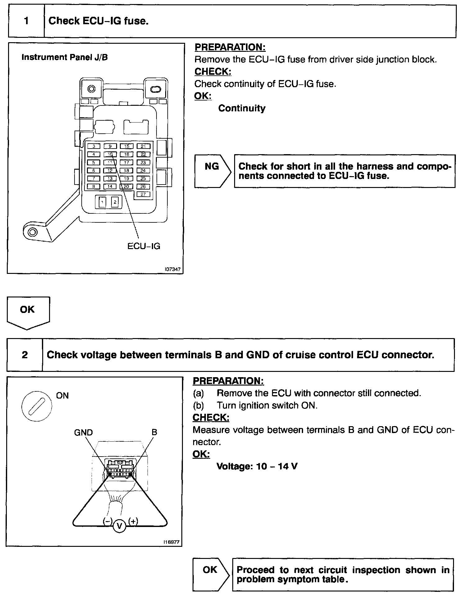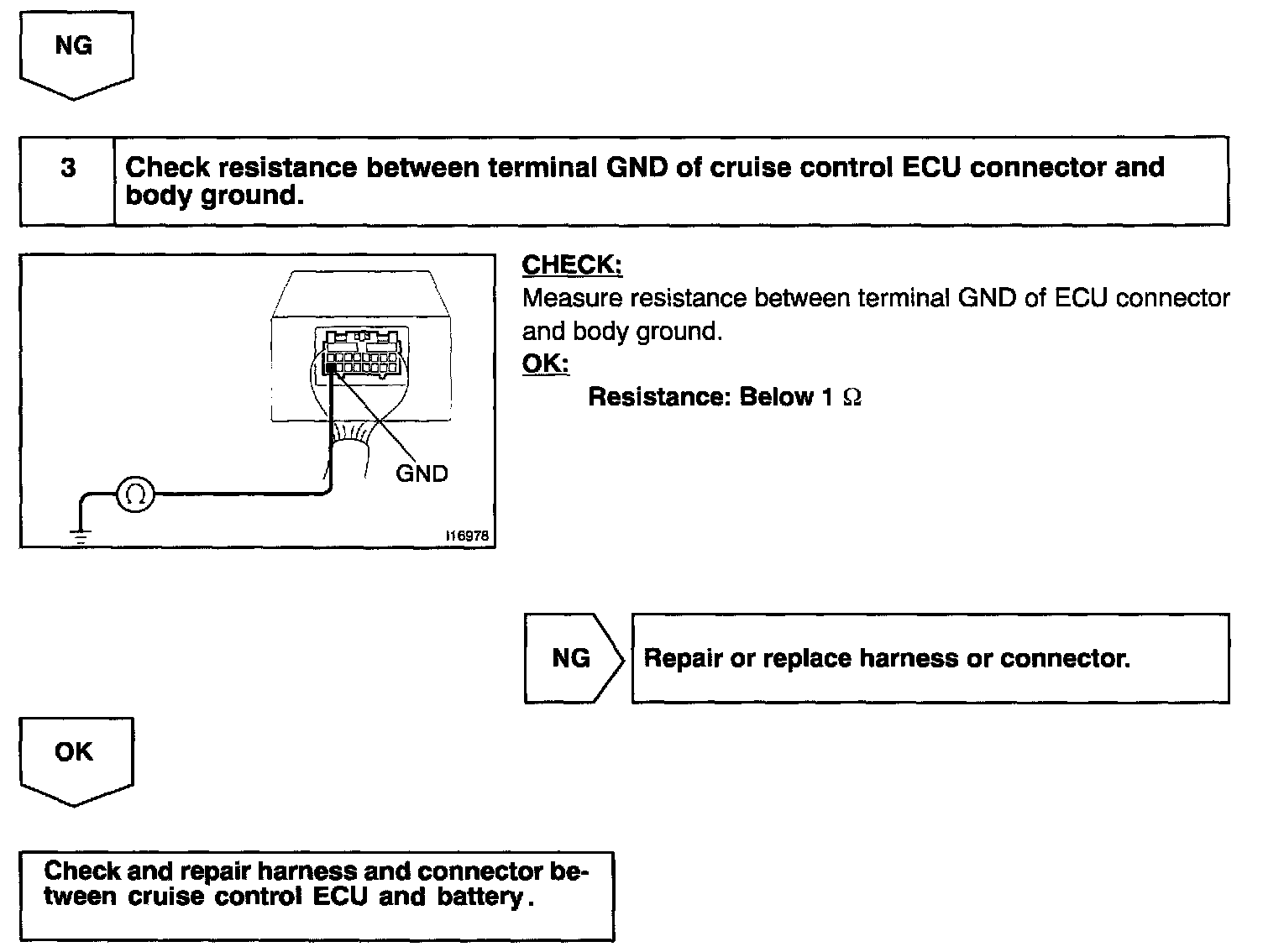 The ECU power source supplies power to the actuator and sensors, etc, when terminal GND and the cruise control ECU case are grounded.