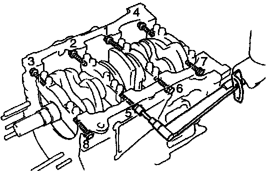 ^ The main bearing cap bolts are tightened in 2 progressive steps (steps (b) and (d)).