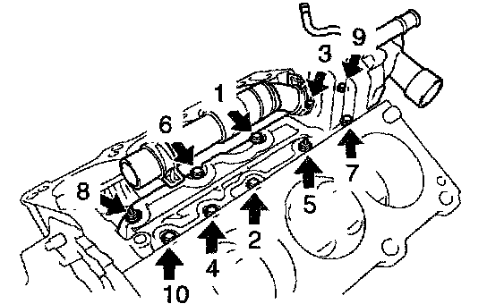 c. Install the water inlet housing with the 8 bolts and 2 nuts. Uniformly tighten the bolts and nuts in several passes, in the sequence shown.