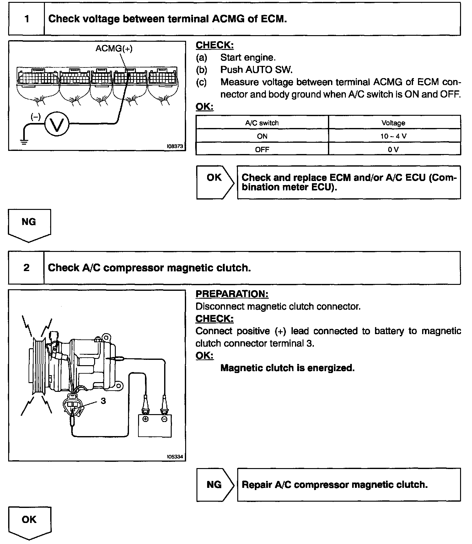 The A/C ECU (Combination meter ECU) outputs the magnetic clutch ON signal from terminal MGC to the ECM. When the ECM receives this signal, it sends a signal from terminal ACMG and switches the A/C magnetic clutch relay ON, thus turning the A/C compressor magnetic clutch ON.
