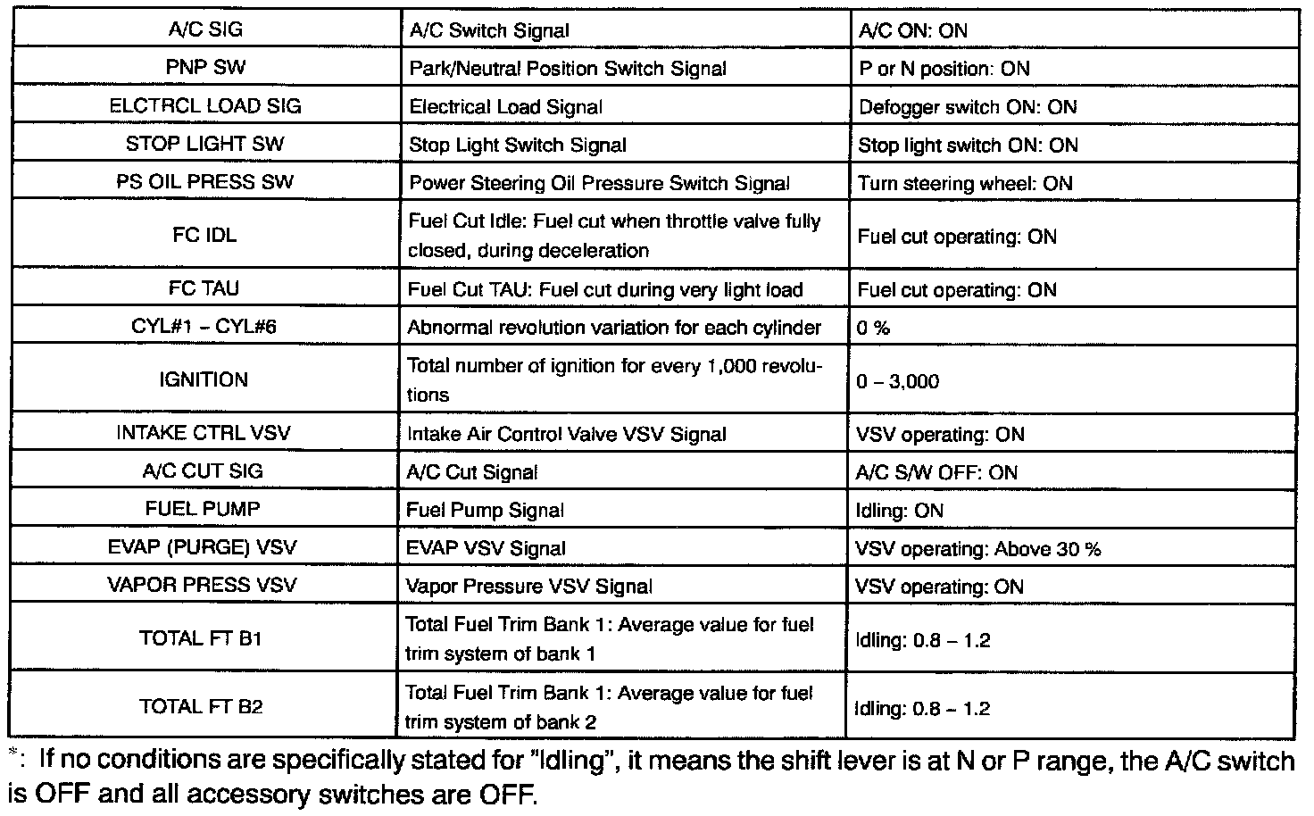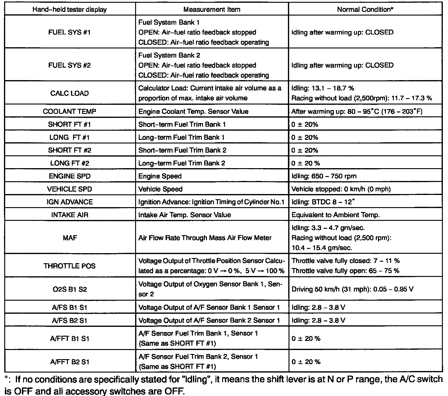 ENGINE OPERATING CONDITIONNOTE: The values given below for "Normal Condition" are representative values, so a vehicle may still be normal even if its value from those listed here. So do not decide whether a part is faulty or not solely according to the "Normal Condition" here.
