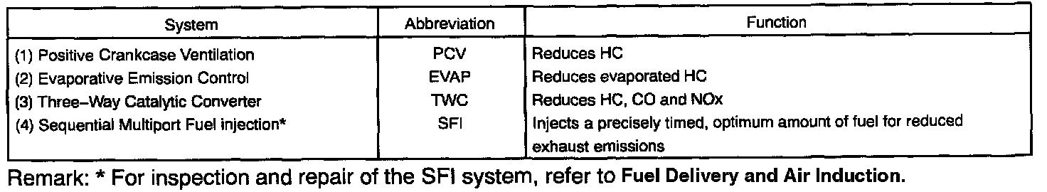 The emission control systems are installed to reduce the amount of CO, HC and NOx exhausted from the engine ((3) and (4)), to prevent the atmospheric release of blow-by gas-containing HC (1) and evaporated fuel containing HC being released from the fuel tank (2).