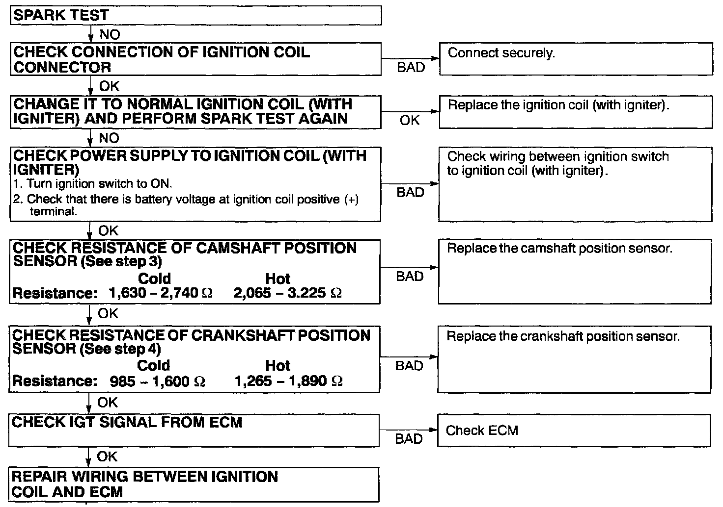 NOTE: To prevent gasoline from being injected from injectors during this test, crank the engine for no more than 5 - 10 seconds at time. If the spark done not occur, do the test as follows: