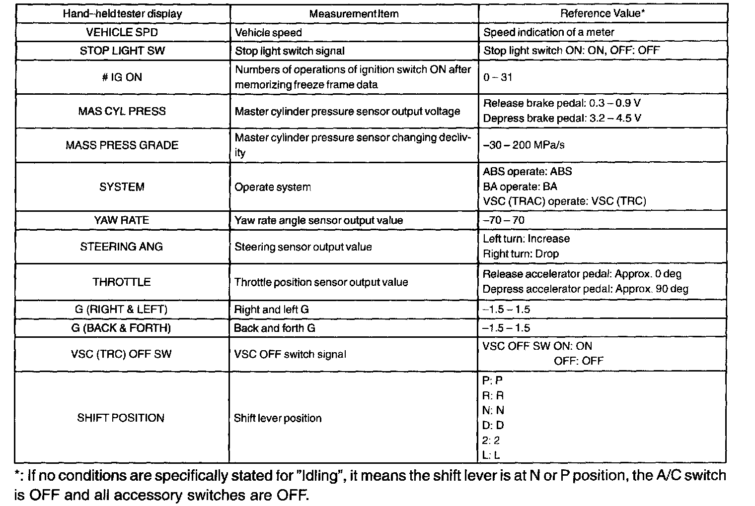 FREEZE FRAME DATAa. The vehicle (sensor) status memorized during ABS and/or VSC operation or at the time of error code detection can be displayed using the LEXUS hand-held tester.