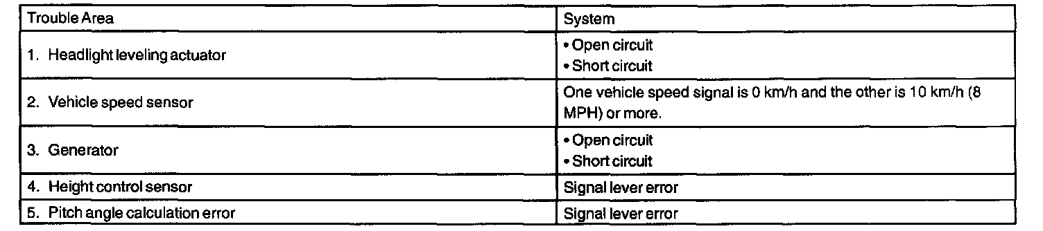 HINT: The Headlight Leveling Control ECU performs the fail-safe when detecting following troubles. At this it lights the warning Indicator light on the combination meter.