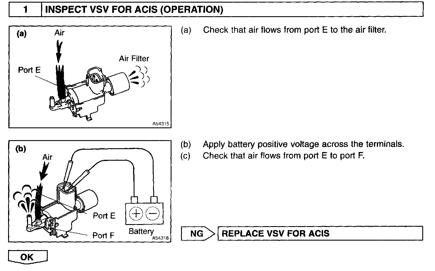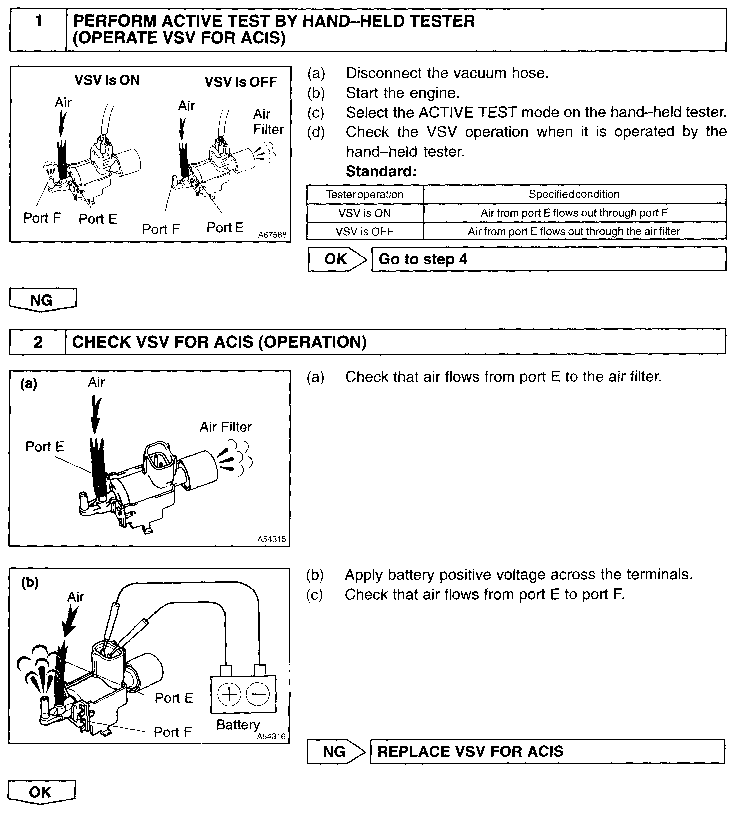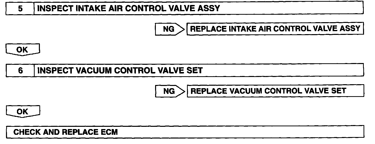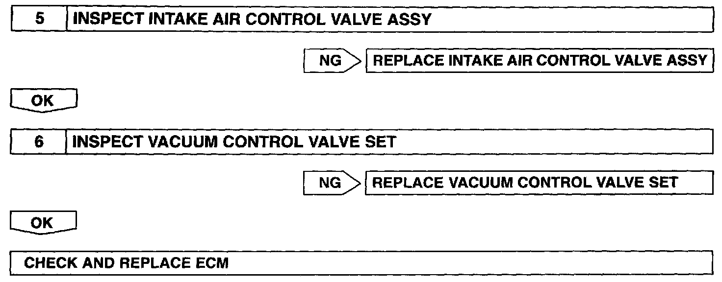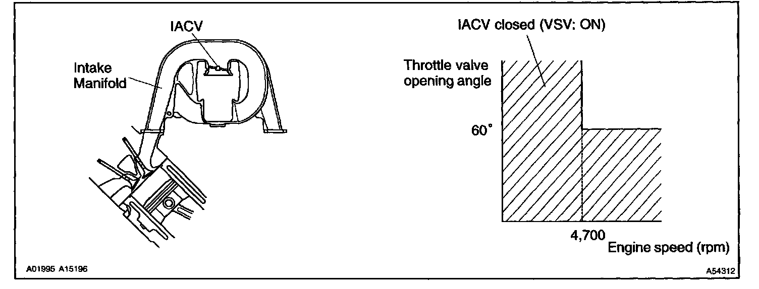 When the engine speed is 4,700 rpm or more and the throttle valve opening angle is 60° or more, the VSV is OFF, so the IACV is open. All the other times, the ECM turns the VSV ON and closes the IACV.
