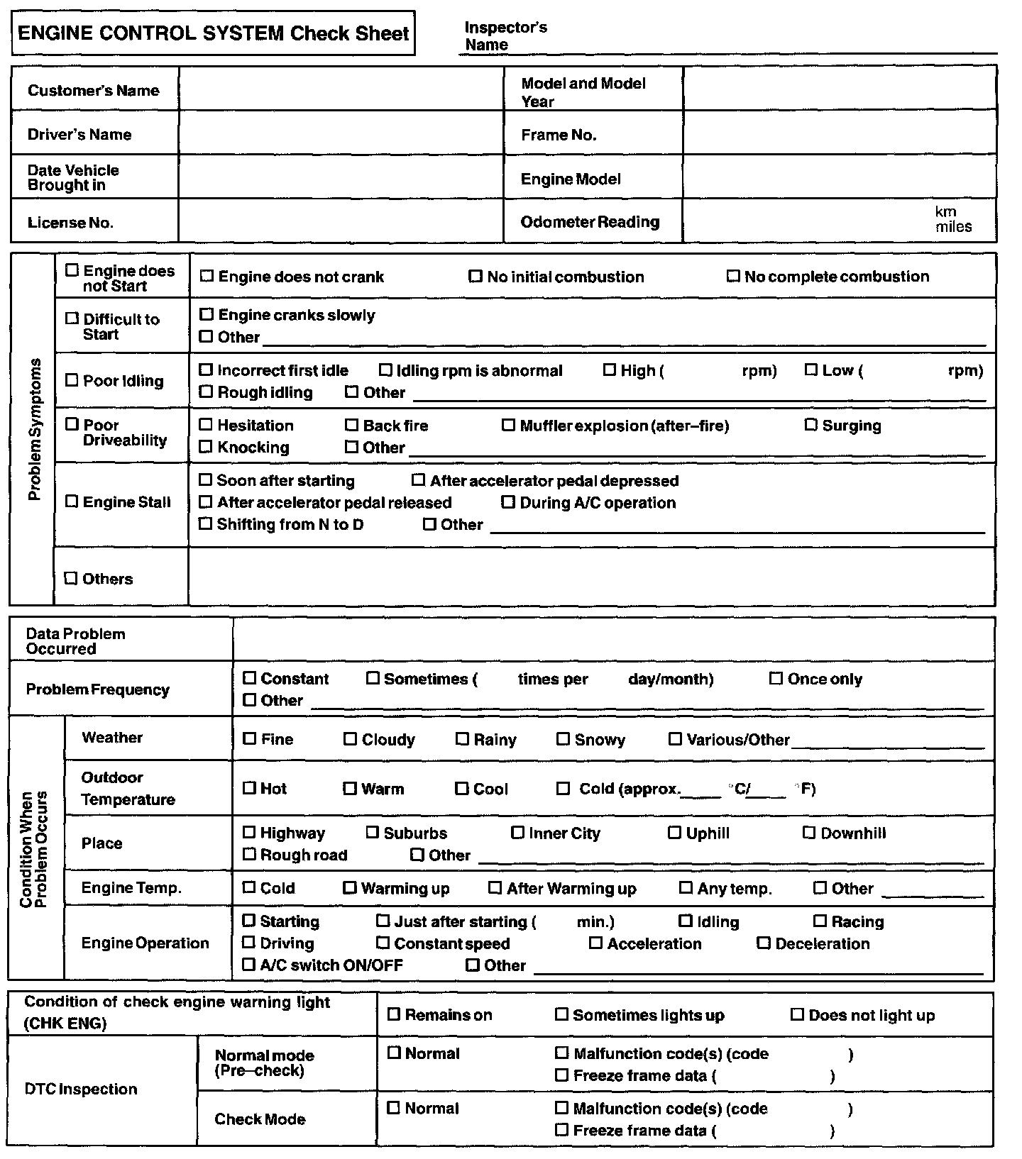 Engine Control System Check Sheet: