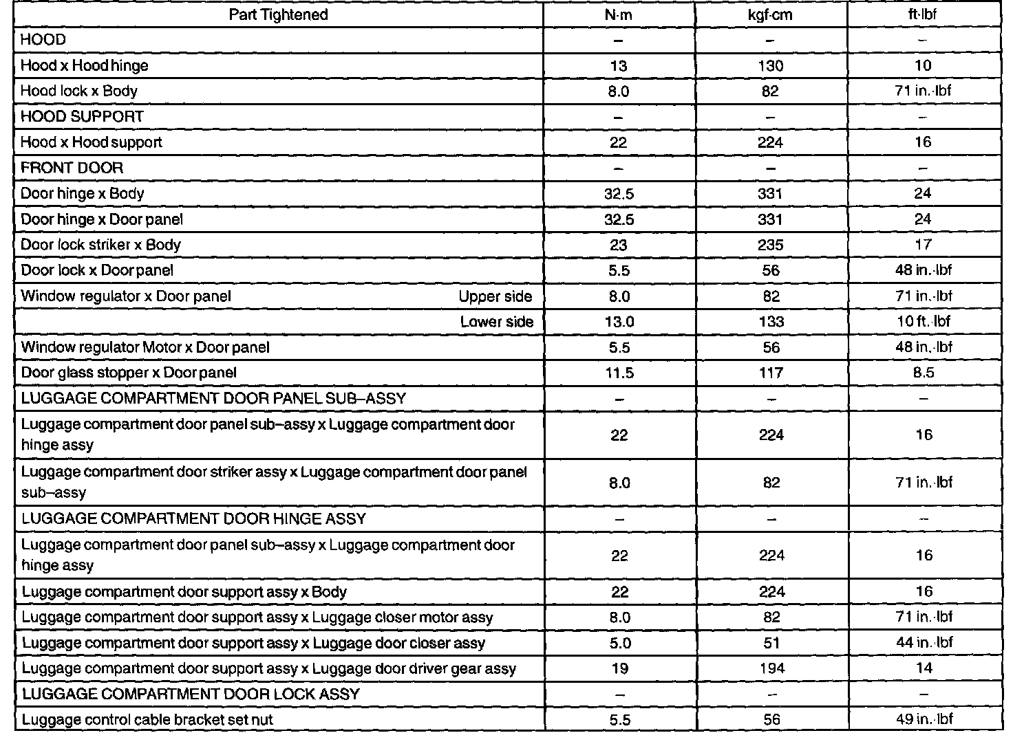 Engine Hood/Door - Torque Specification: