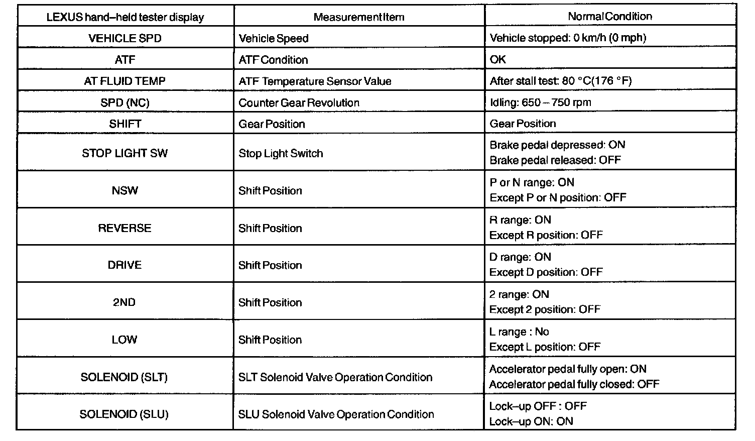 AUTOMATIC TRANSAXLE CONDITIONNOTE: The values given for "Normal Condition" are representative values, so a vehicle may still be normal even if its value differs from those listed here. Do not depend solely on the "Normal Condition" here when deciding whether or not the part is faulty.