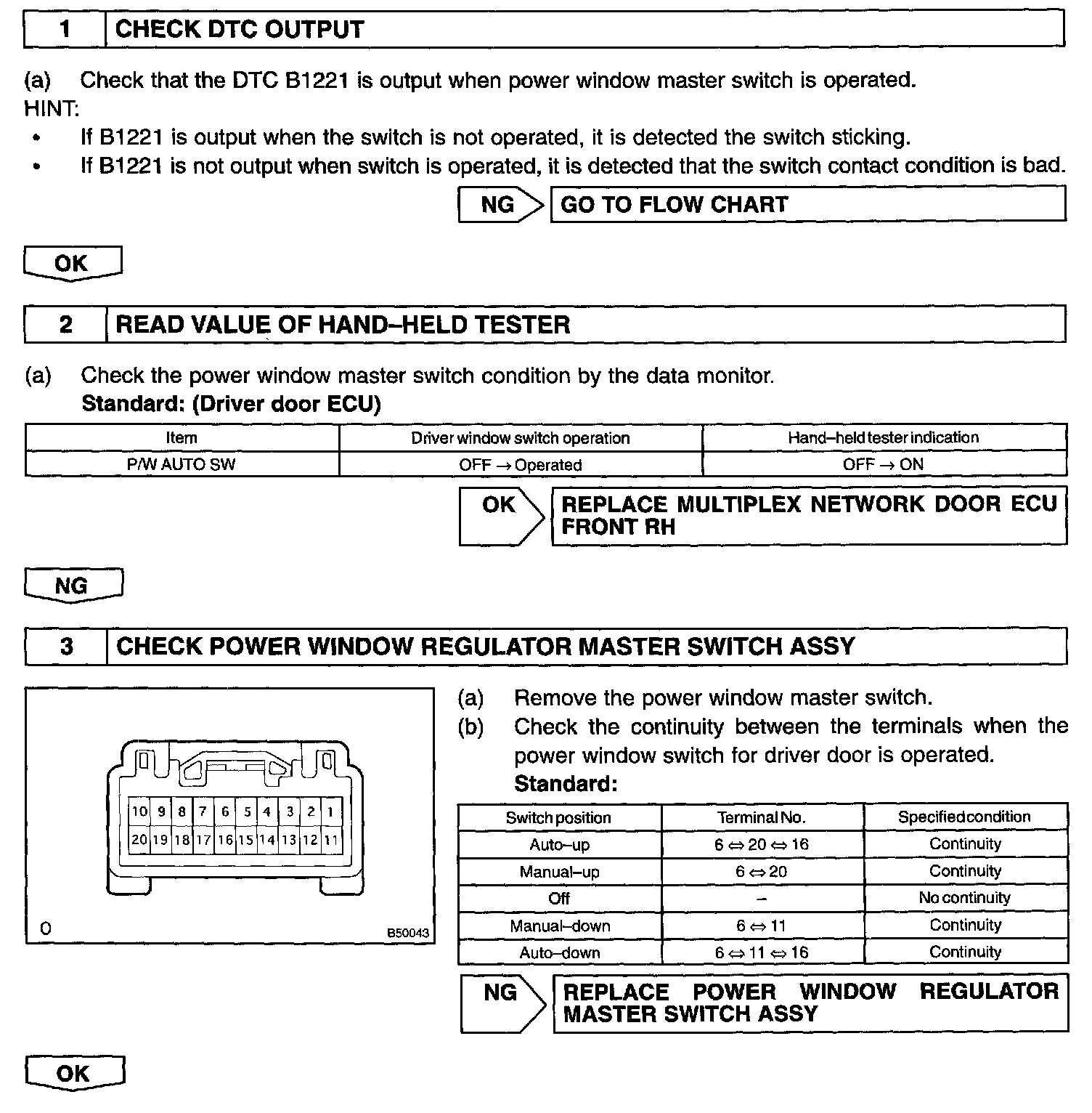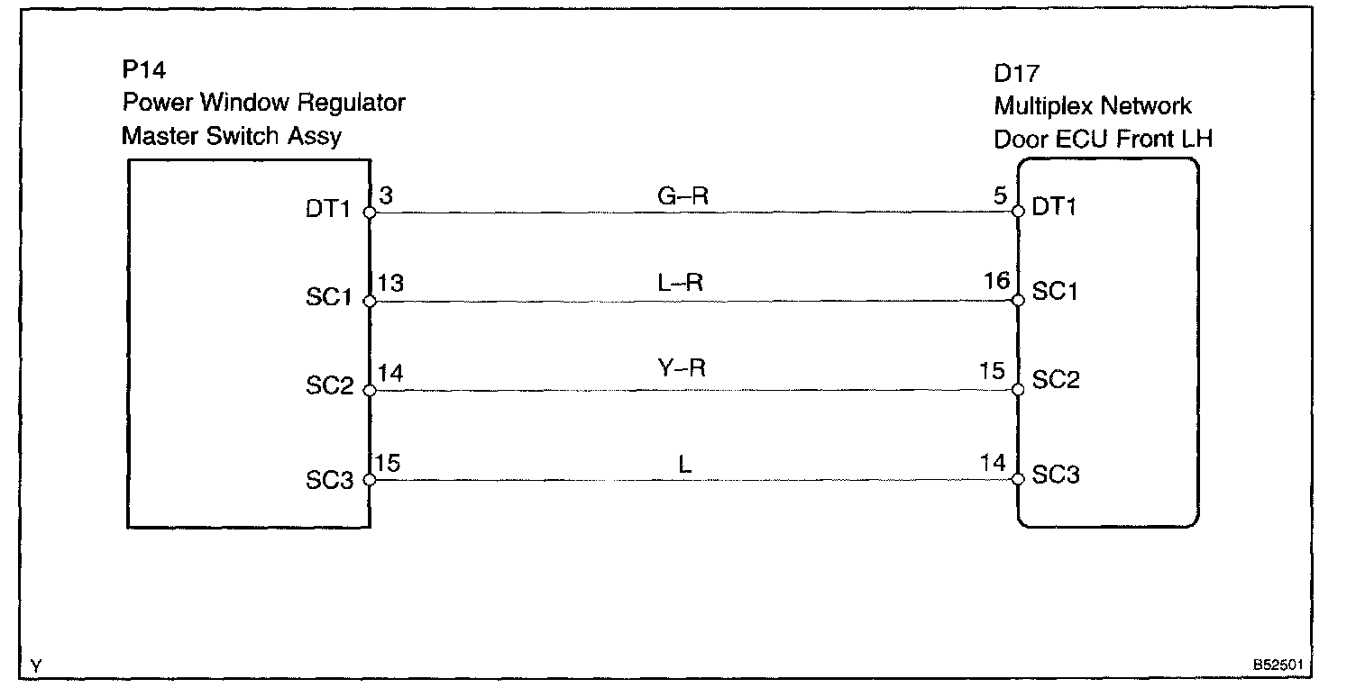 NOTE: The power window system has a function with large-scale body multiplex communications. First of all, inspect the communication function depending on the "How To Proceed With Troubleshooting", and check there is no abnormality in the communication system. Then, finally proceed with the troubleshooting. Also, if the power window system has a malfunction in the jam protection function, the AUTO operations are prohibited Because of this, confirm that the diagnosis code is normal before the troubleshooting.