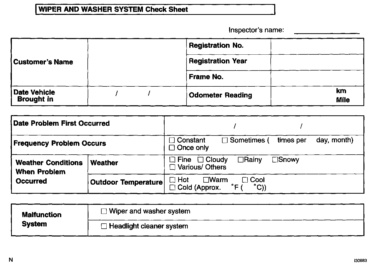 Wiper And Washer System Check Sheet: