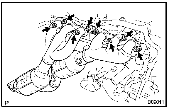 c. Using a 14 mm deep socket wrench, install new exhaust manifold with 8 new nuts. Uniformly tighten the nuts in several passes.