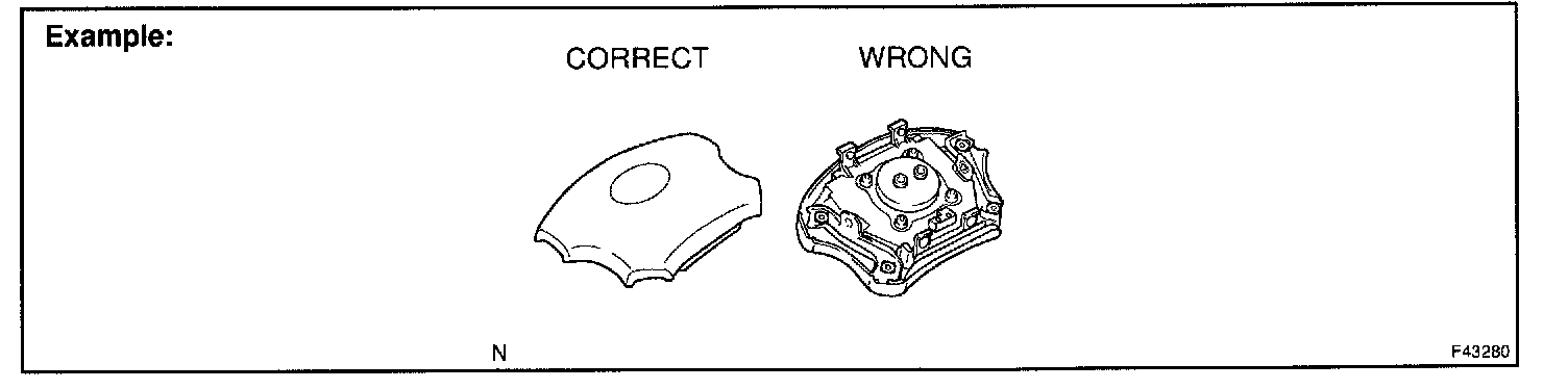 1. When removing the horn button assembly or handling a new horn button, it should be placed with the top of the top surface facing upward. Placing it with the pad surface facing downward may lead to a serious accident if the airbag deploys for some reasons. Also, do not place anything on top of the the horn button.