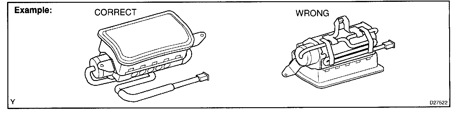 1. Always place a removed or new front seat airbag assembly with the airbag inflation direction facing upward. Placing the airbag assembly with the airbag inflation direction facing downward could cause a serious accident if the airbag deploys.