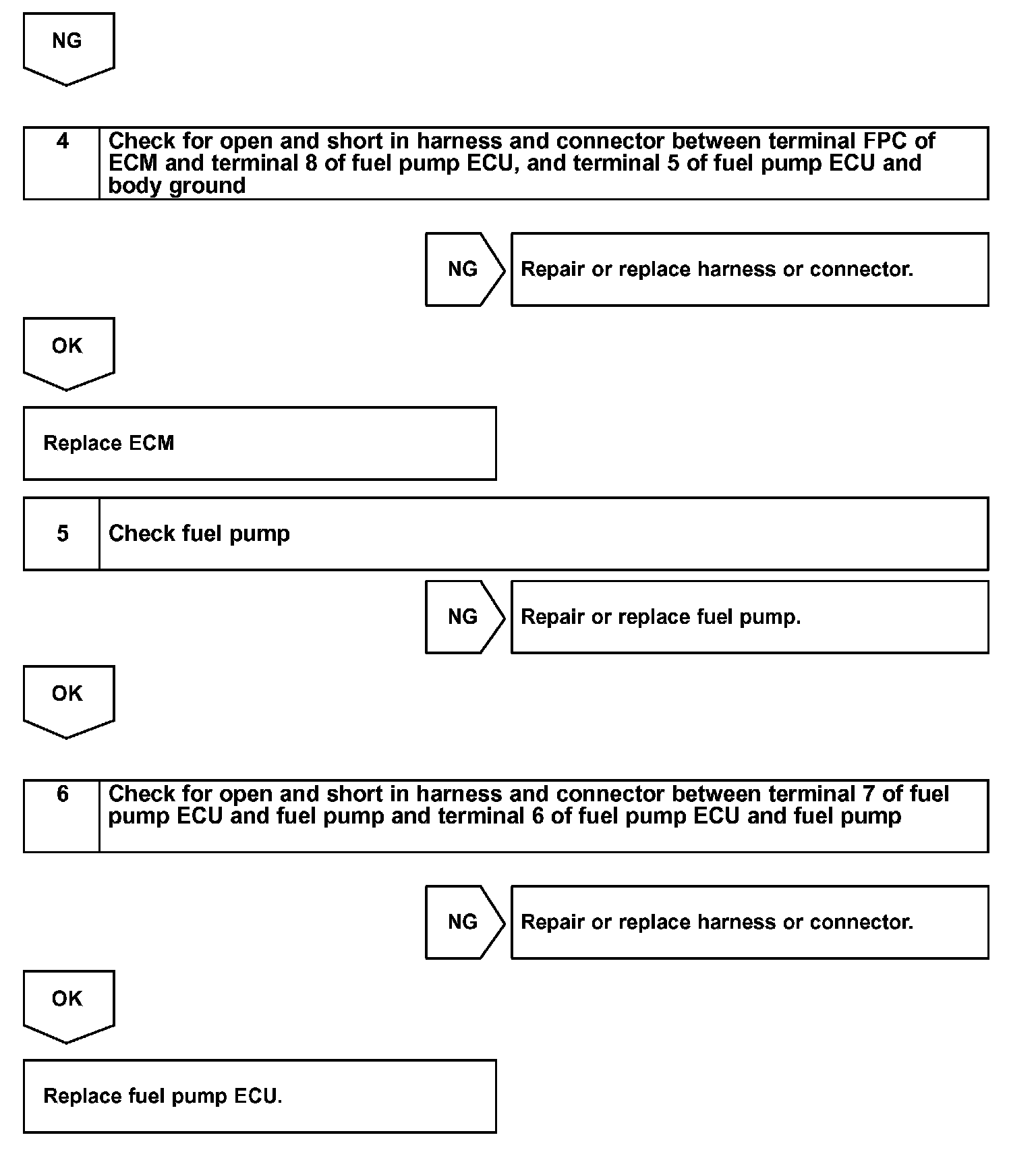 When the engine is idling or carries a light load, the ECM sends a Low signal (about 1.3 V) to the fuel pump ECU (FPC terminal).